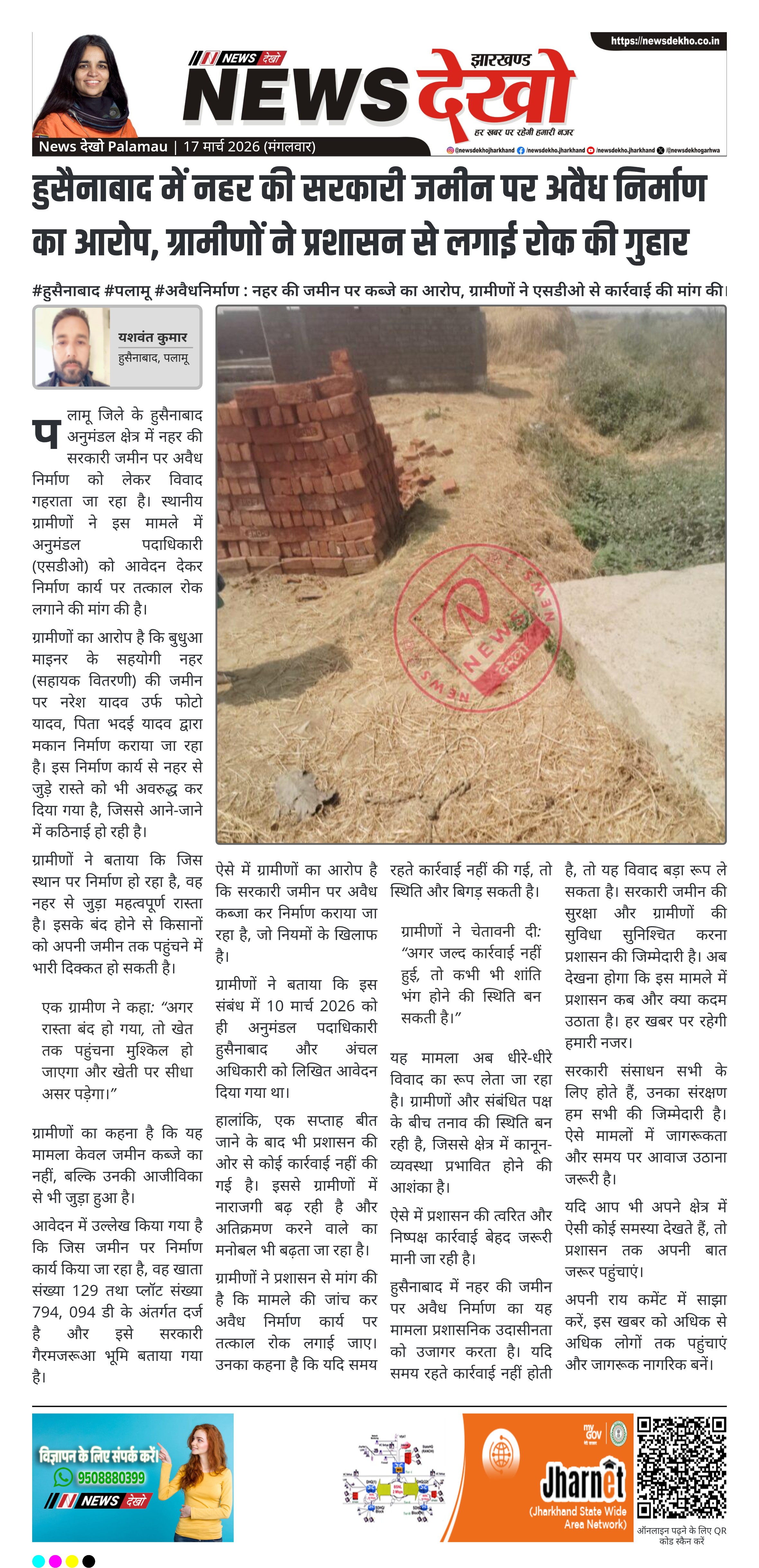 #हुसैनाबाद #पलामू #अवैधनिर्माण : नहर की जमीन पर कब्जे का आरोप, ग्रामीणों ने एसडीओ से कार्रवाई की मांग की।