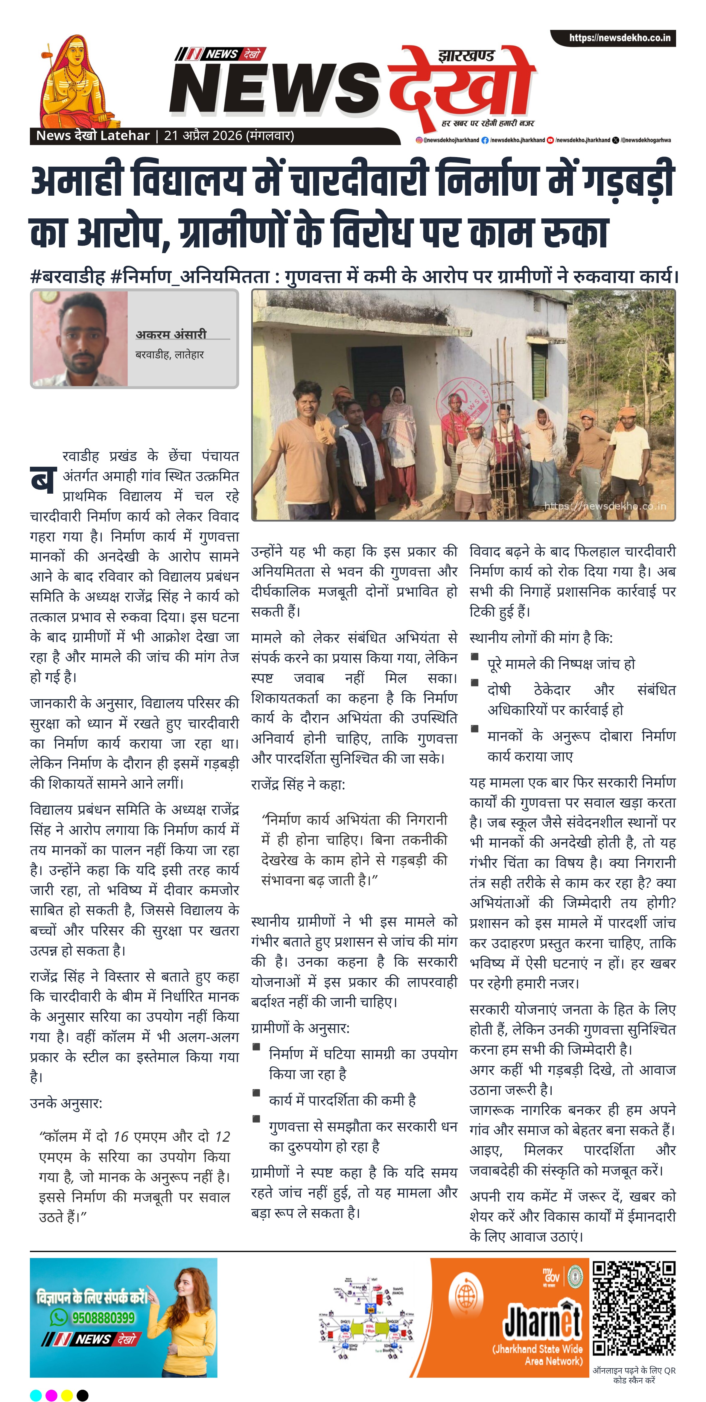 लातेहार जिले के बरवाडीह प्रखंड के अमाही गांव स्थित उत्क्रमित प्राथमिक विद्यालय में चारदीवारी निर्माण कार्य पर अनियमितता के आरोप लगे हैं। विद्यालय प्रबंधन समिति के अध्यक्ष ने गुणवत्ता में कमी का हवाला देते हुए कार्य को रुकवा दिया। ग्रामीणों ने भी निर्माण में मानकों की अनदेखी का आरोप लगाते हुए जांच की मांग की है। फिलहाल निर्माण कार्य बंद है और प्रशासनिक कार्रवाई की प्रतीक्षा की जा रही है।