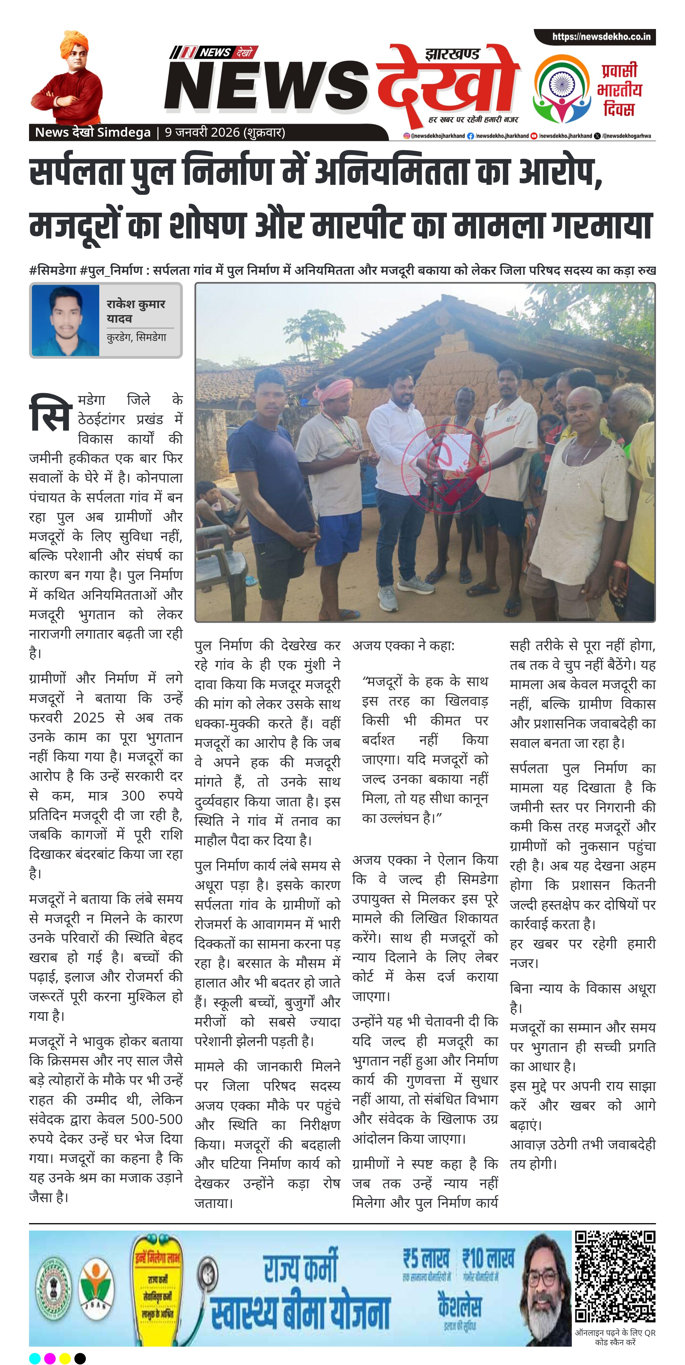 सिमडेगा जिले के ठेठईटांगर प्रखंड में विकास कार्यों की जमीनी हकीकत एक बार फिर सवालों के घेरे में है। कोनपाला पंचायत के सर्पलता गांव में बन रहा पुल अब ग्रामीणों और मजदूरों के लिए सुविधा नहीं, बल्कि परेशानी और संघर्ष का कारण बन गया है। पुल निर्माण में कथित अनियमितताओं और मजदूरी भुगतान को लेकर नाराजगी लगातार बढ़ती जा रही है।