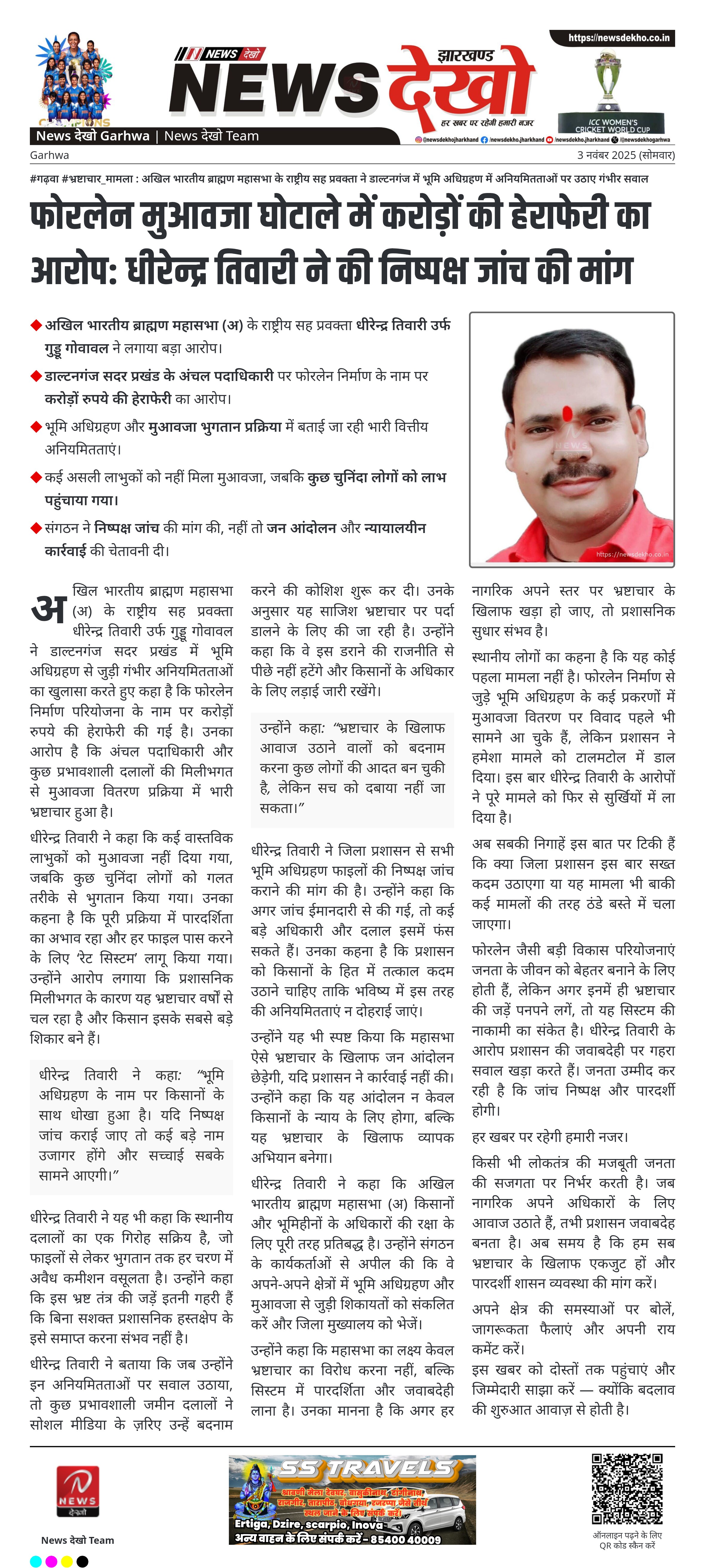 #गढ़वा #भ्रष्टाचार_मामला : अखिल भारतीय ब्राह्मण महासभा के राष्ट्रीय सह प्रवक्ता ने डाल्टनगंज में भूमि अधिग्रहण में अनियमितताओं पर उठाए गंभीर सवाल
