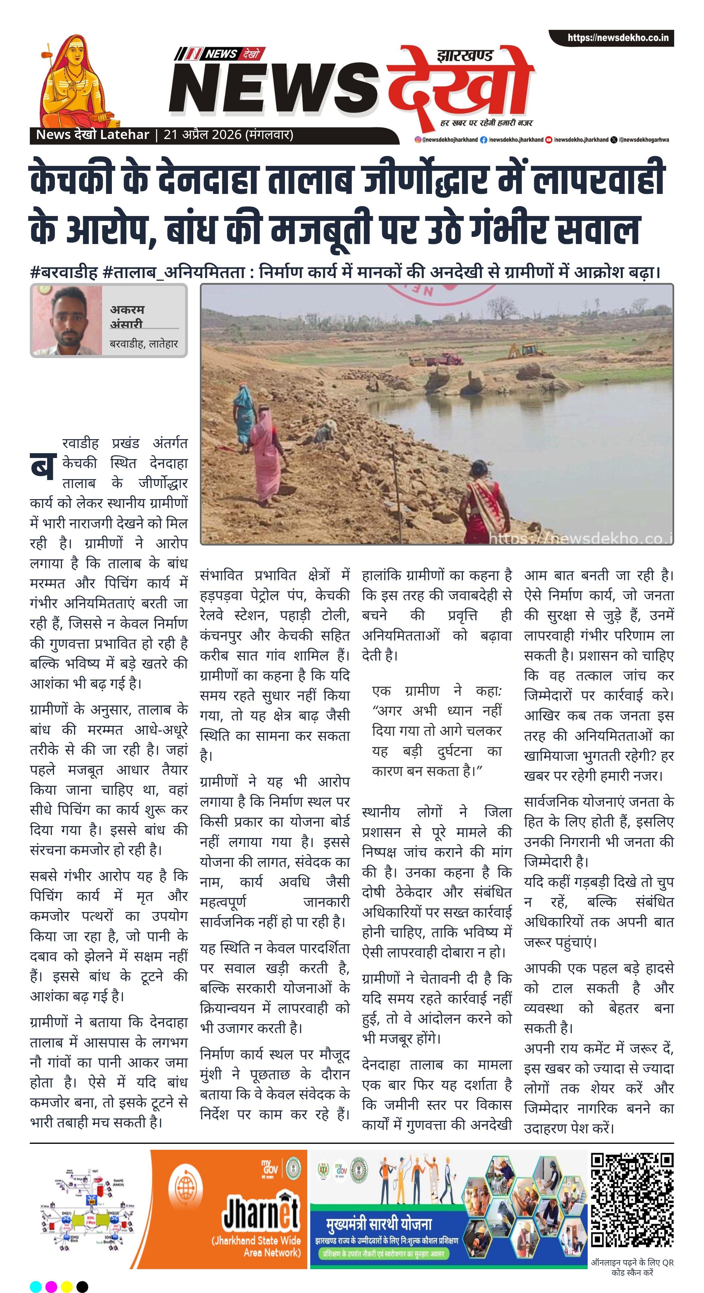 देनदाहा तालाब का मामला एक बार फिर यह दर्शाता है कि जमीनी स्तर पर विकास कार्यों में गुणवत्ता की अनदेखी आम बात बनती जा रही है। ऐसे निर्माण कार्य, जो जनता की सुरक्षा से जुड़े हैं, उनमें लापरवाही गंभीर परिणाम ला सकती है। प्रशासन को चाहिए कि वह तत्काल जांच कर जिम्मेदारों पर कार्रवाई करे। आखिर कब तक जनता इस तरह की अनियमितताओं का खामियाजा भुगतती रहेगी? हर खबर पर रहेगी हमारी नजर।