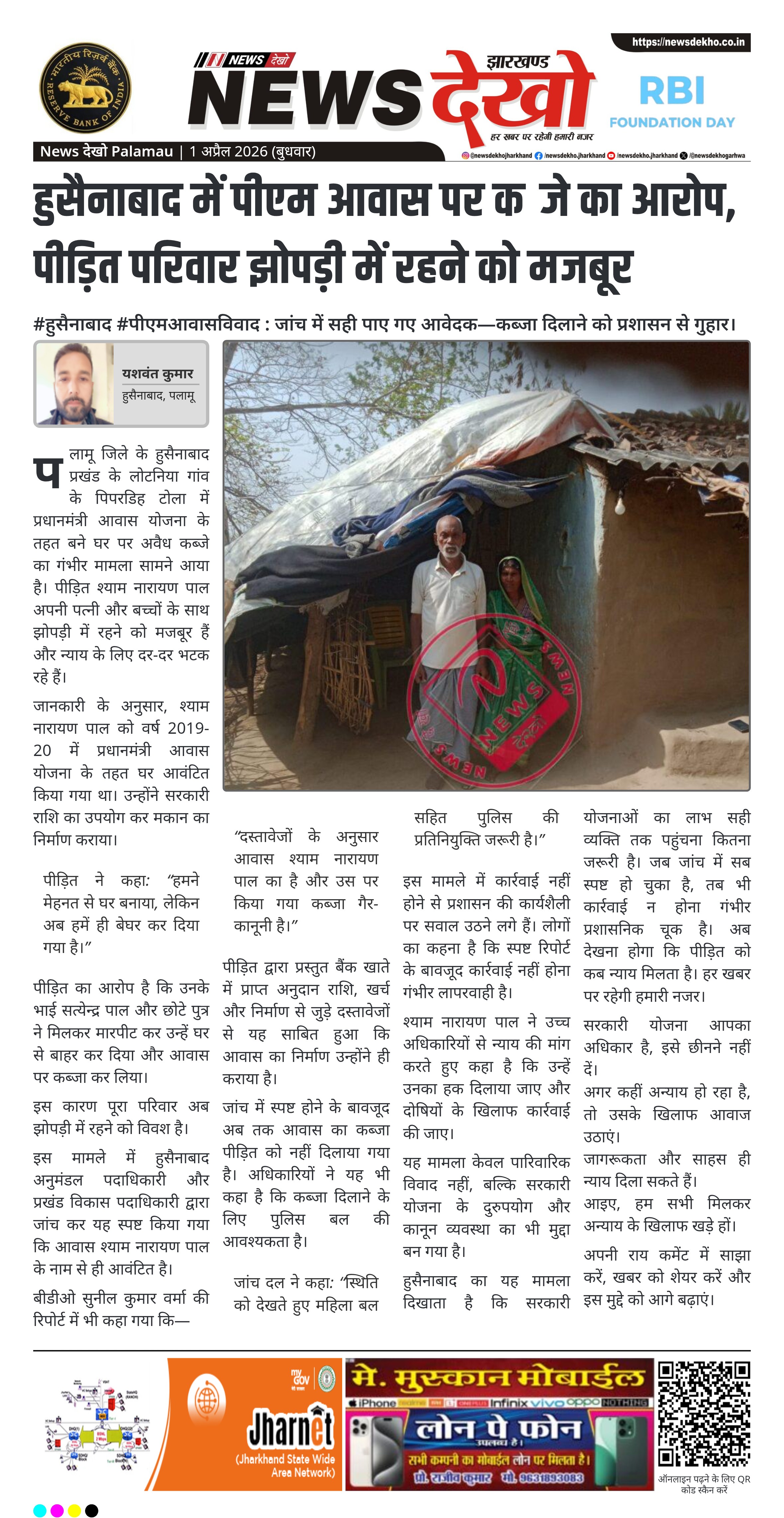 पलामू जिले के हुसैनाबाद प्रखंड के लोटनिया गांव के पिपरडिह टोला में प्रधानमंत्री आवास योजना के तहत बने घर पर अवैध कब्जे का गंभीर मामला सामने आया है। पीड़ित श्याम नारायण पाल अपनी पत्नी और बच्चों के साथ झोपड़ी में रहने को मजबूर हैं और न्याय के लिए दर-दर भटक रहे हैं।