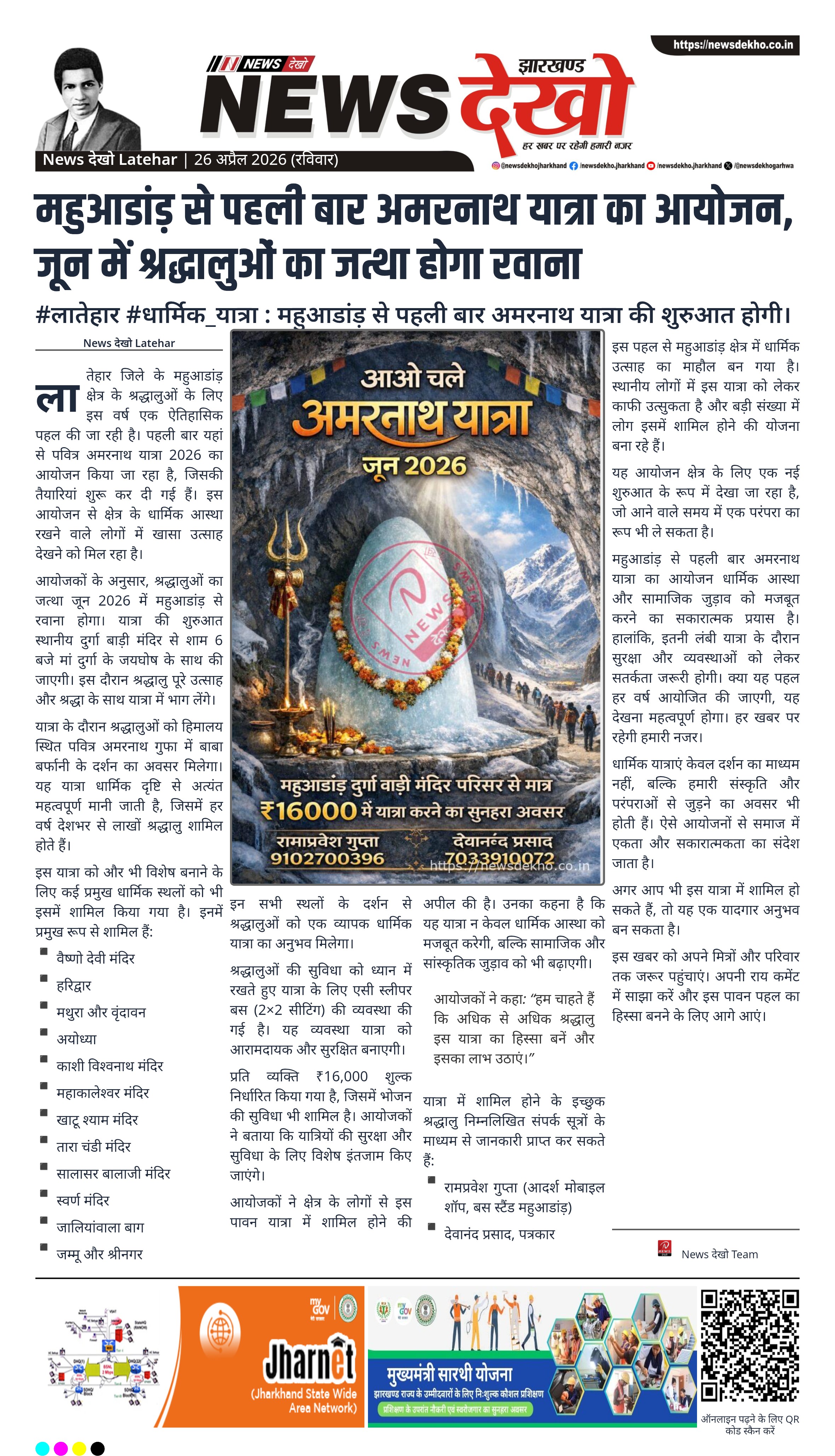 लातेहार जिले के महुआडांड़ से पहली बार अमरनाथ यात्रा 2026 का आयोजन किया जा रहा है। जून माह में श्रद्धालुओं का जत्था दुर्गा बाड़ी मंदिर से रवाना होगा। यात्रा के दौरान देश के कई प्रमुख धार्मिक स्थलों के दर्शन कराए जाएंगे। यह पहल क्षेत्र के श्रद्धालुओं के लिए विशेष महत्व रखती है।