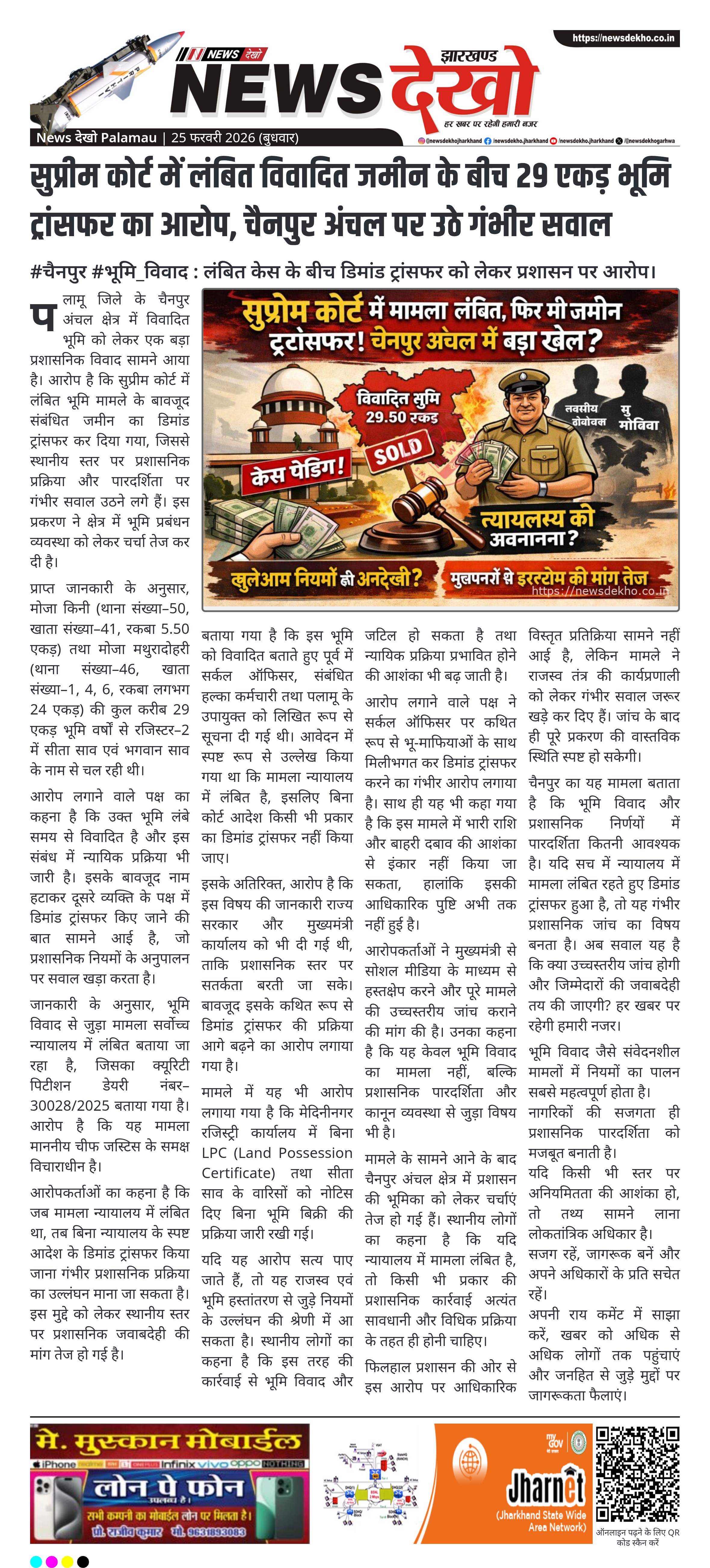 पलामू जिले के चैनपुर अंचल क्षेत्र में विवादित भूमि को लेकर एक बड़ा प्रशासनिक विवाद सामने आया है। आरोप है कि सुप्रीम कोर्ट में लंबित भूमि मामले के बावजूद संबंधित जमीन का डिमांड ट्रांसफर कर दिया गया, जिससे स्थानीय स्तर पर प्रशासनिक प्रक्रिया और पारदर्शिता पर गंभीर सवाल उठने लगे हैं। इस प्रकरण ने क्षेत्र में भूमि प्रबंधन व्यवस्था को लेकर चर्चा तेज कर दी है।