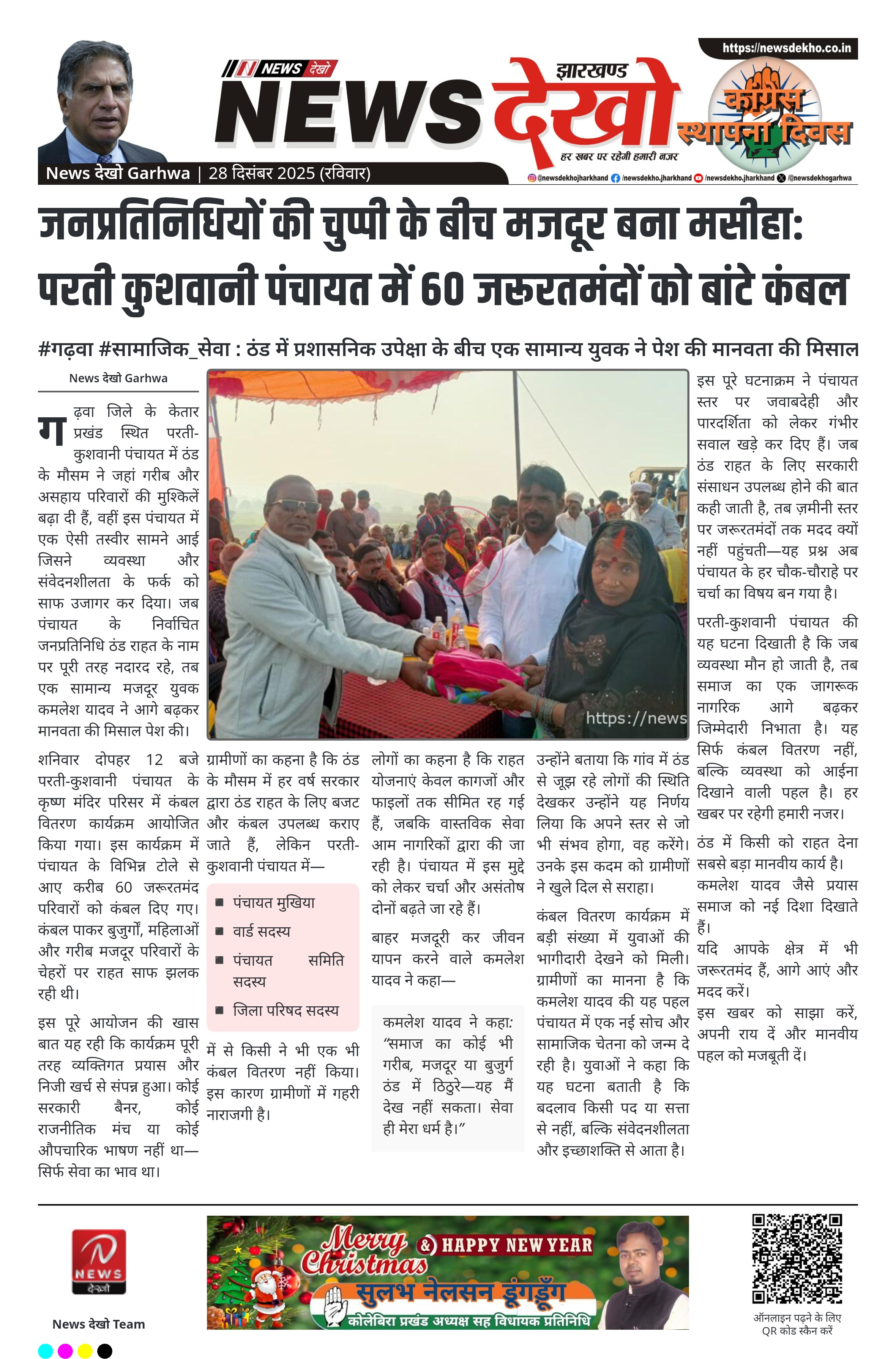 गढ़वा जिले के केतार प्रखंड अंतर्गत परती-कुशवानी पंचायत में कड़ाके की ठंड के दौरान एक मजदूर युवक द्वारा किए गए कंबल वितरण ने स्थानीय प्रशासन और जनप्रतिनिधियों की भूमिका पर सवाल खड़े कर दिए हैं। पंचायत स्तर पर किसी भी निर्वाचित जनप्रतिनिधि द्वारा ठंड राहत का कोई प्रयास नहीं किया गया, जबकि बाहर मजदूरी करने वाले कमलेश यादव ने अपने निजी खर्च से 60 जरूरतमंद परिवारों को कंबल वितरित किए। यह पहल ठंड से जूझ रहे गरीब, वृद्ध और असहाय ग्रामीणों के लिए बड़ी राहत बनी।