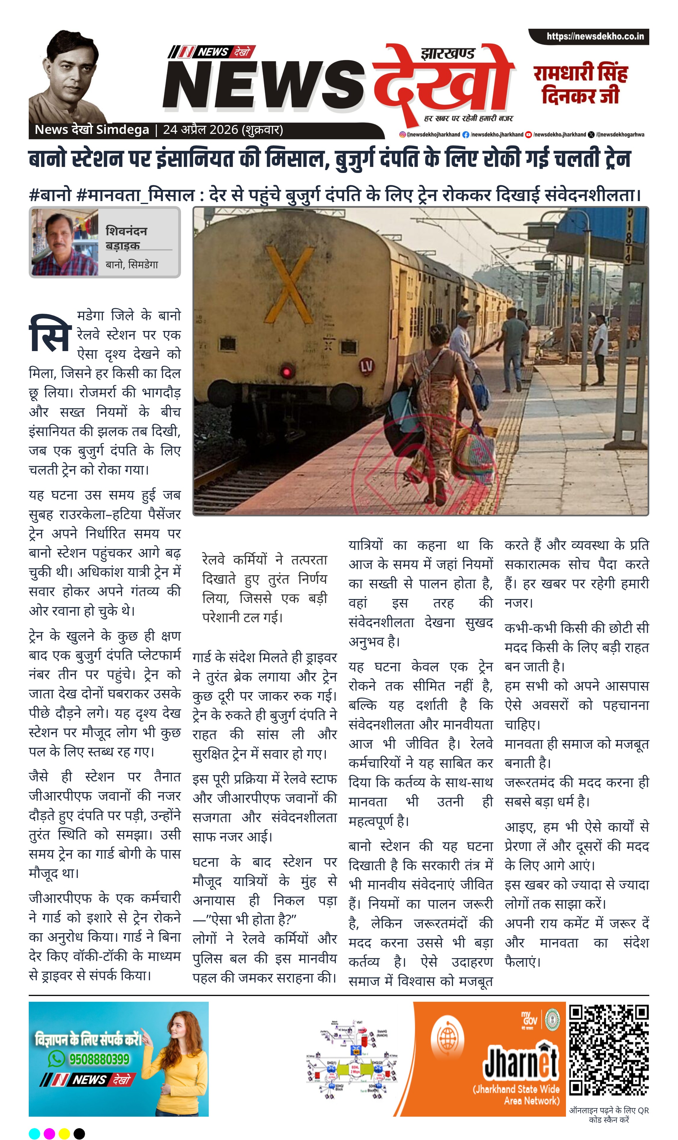 सिमडेगा जिले के बानो रेलवे स्टेशन पर एक ऐसा दृश्य देखने को मिला, जिसने हर किसी का दिल छू लिया। रोजमर्रा की भागदौड़ और सख्त नियमों के बीच इंसानियत की झलक तब दिखी, जब एक बुजुर्ग दंपति के लिए चलती ट्रेन को रोका गया।