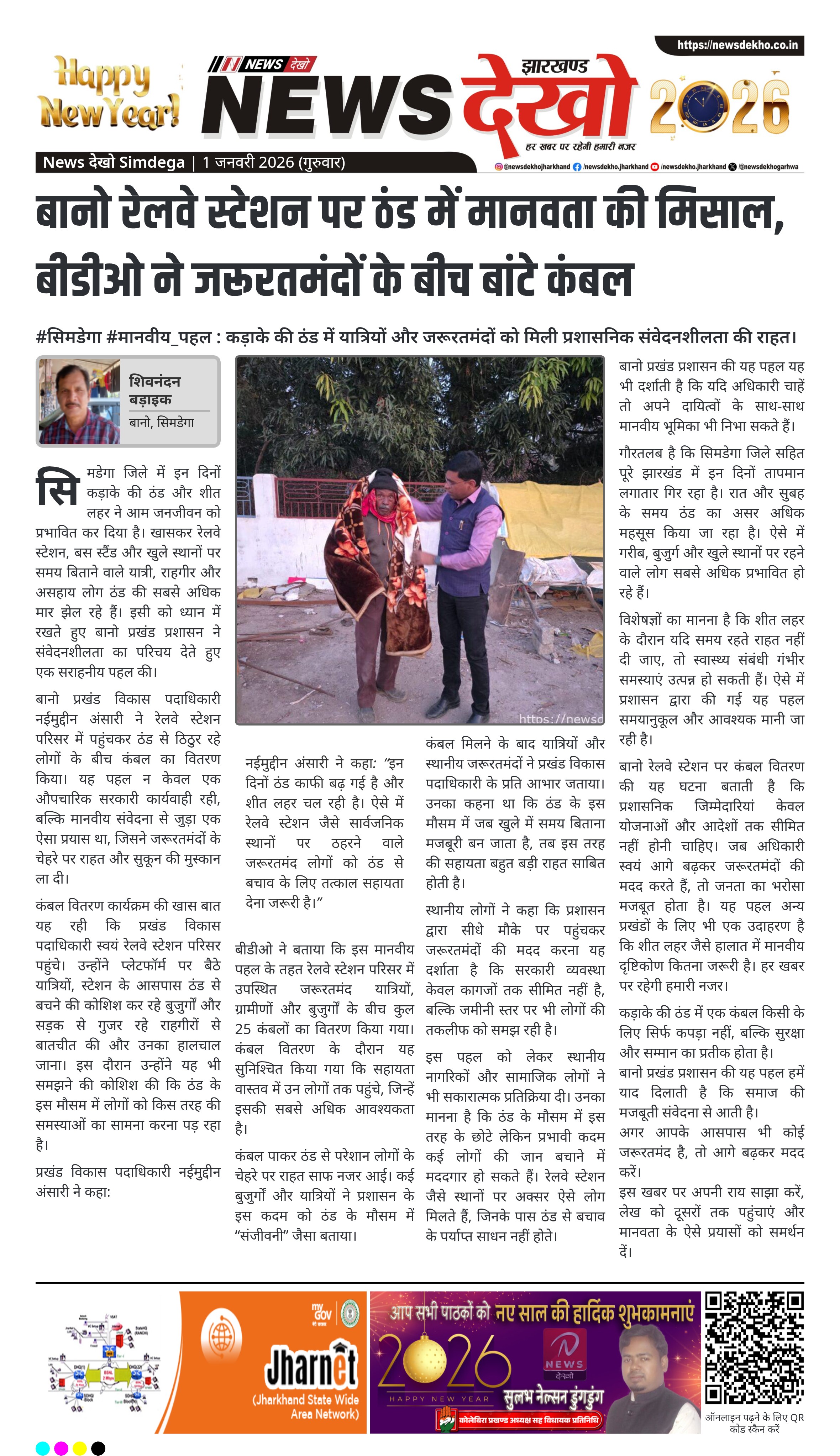 बानो प्रखंड विकास पदाधिकारी नईमुद्दीन अंसारी ने रेलवे स्टेशन परिसर में पहुंचकर ठंड से ठिठुर रहे लोगों के बीच कंबल का वितरण किया। यह पहल न केवल एक औपचारिक सरकारी कार्यवाही रही, बल्कि मानवीय संवेदना से जुड़ा एक ऐसा प्रयास था, जिसने जरूरतमंदों के चेहरे पर राहत और सुकून की मुस्कान ला दी।