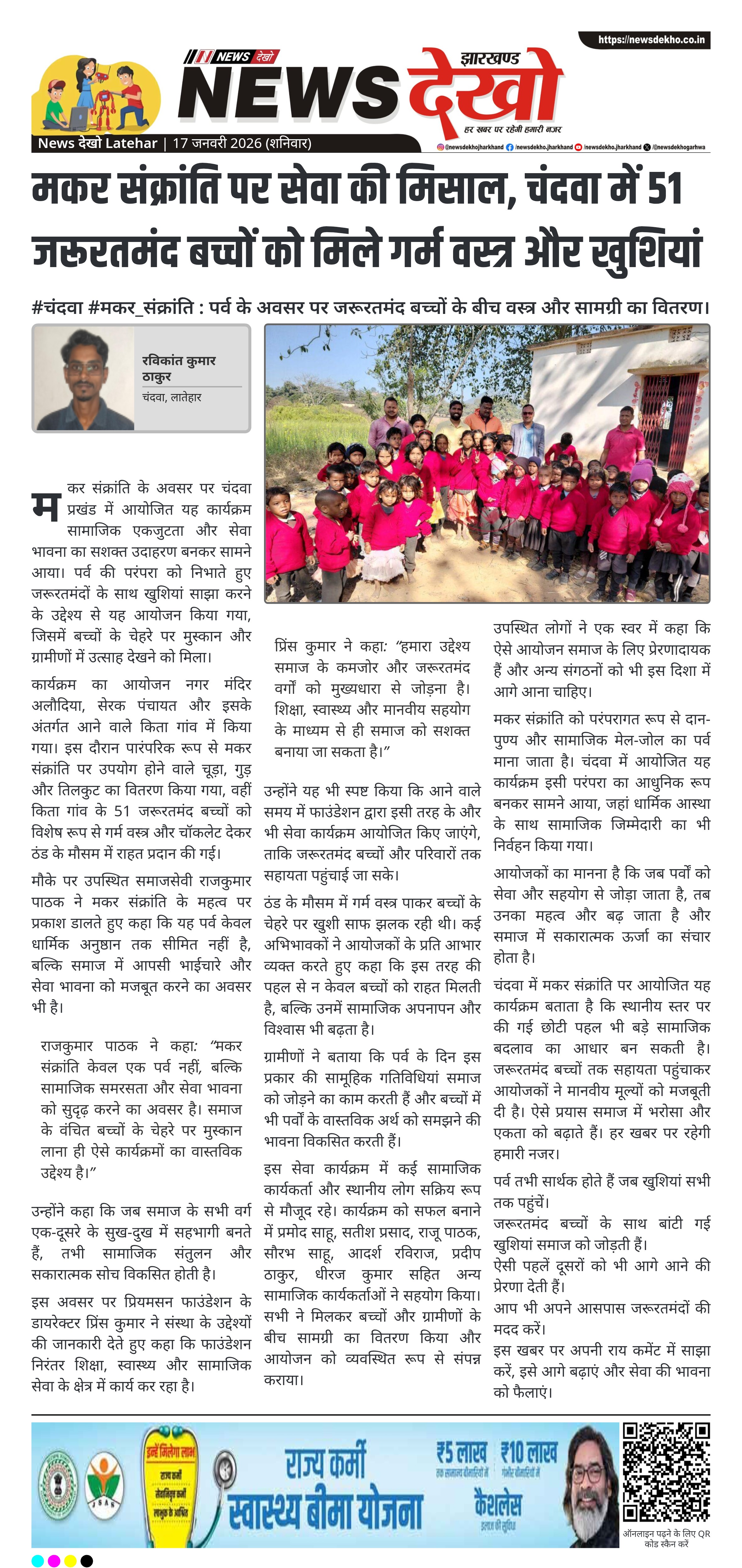 लातेहार जिले के चंदवा प्रखंड में मकर संक्रांति के पावन अवसर पर सामाजिक सरोकार की एक प्रेरणादायक पहल देखने को मिली। प्रियमसन फाउंडेशन और रामानंद साहू चैरिटेबल ट्रस्ट के संयुक्त प्रयास से जरूरतमंद बच्चों और ग्रामीणों के बीच सहायता सामग्री का वितरण किया गया। इस दौरान 51 बच्चों को गर्म वस्त्र और चॉकलेट देकर ठंड से राहत और पर्व की खुशियां साझा की गईं। आयोजन ने समाज में सेवा, समरसता और मानवीय मूल्यों का संदेश दिया।