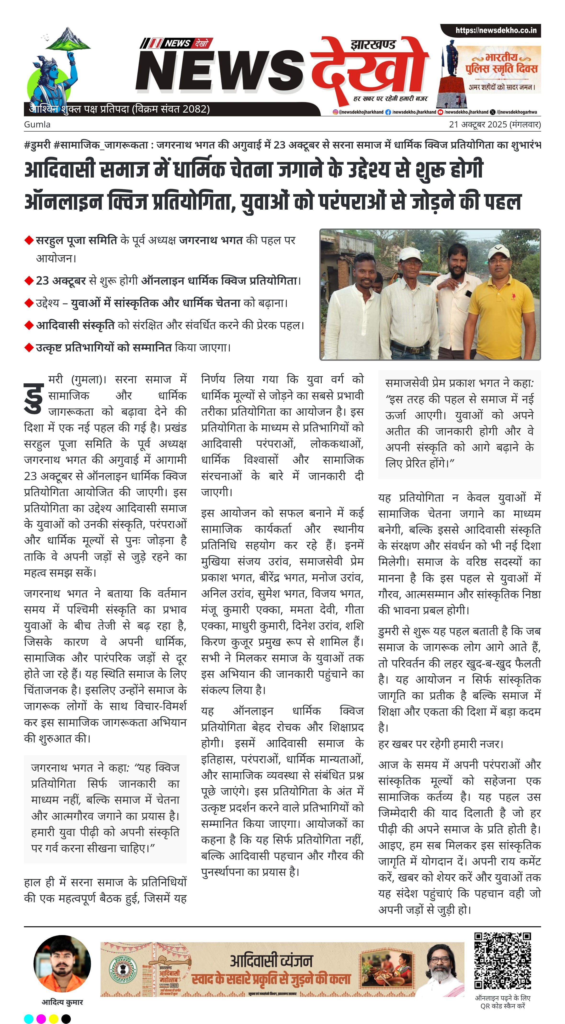डुमरी (गुमला)। सरना समाज में सामाजिक और धार्मिक जागरूकता को बढ़ावा देने की दिशा में एक नई पहल की गई है। प्रखंड सरहुल पूजा समिति के पूर्व अध्यक्ष जगरनाथ भगत की अगुवाई में आगामी 23 अक्टूबर से ऑनलाइन धार्मिक क्विज प्रतियोगिता आयोजित की जाएगी। इस प्रतियोगिता का उद्देश्य आदिवासी समाज के युवाओं को उनकी संस्कृति, परंपराओं और धार्मिक मूल्यों से पुनः जोड़ना है ताकि वे अपनी जड़ों से जुड़े रहने का महत्व समझ सकें।