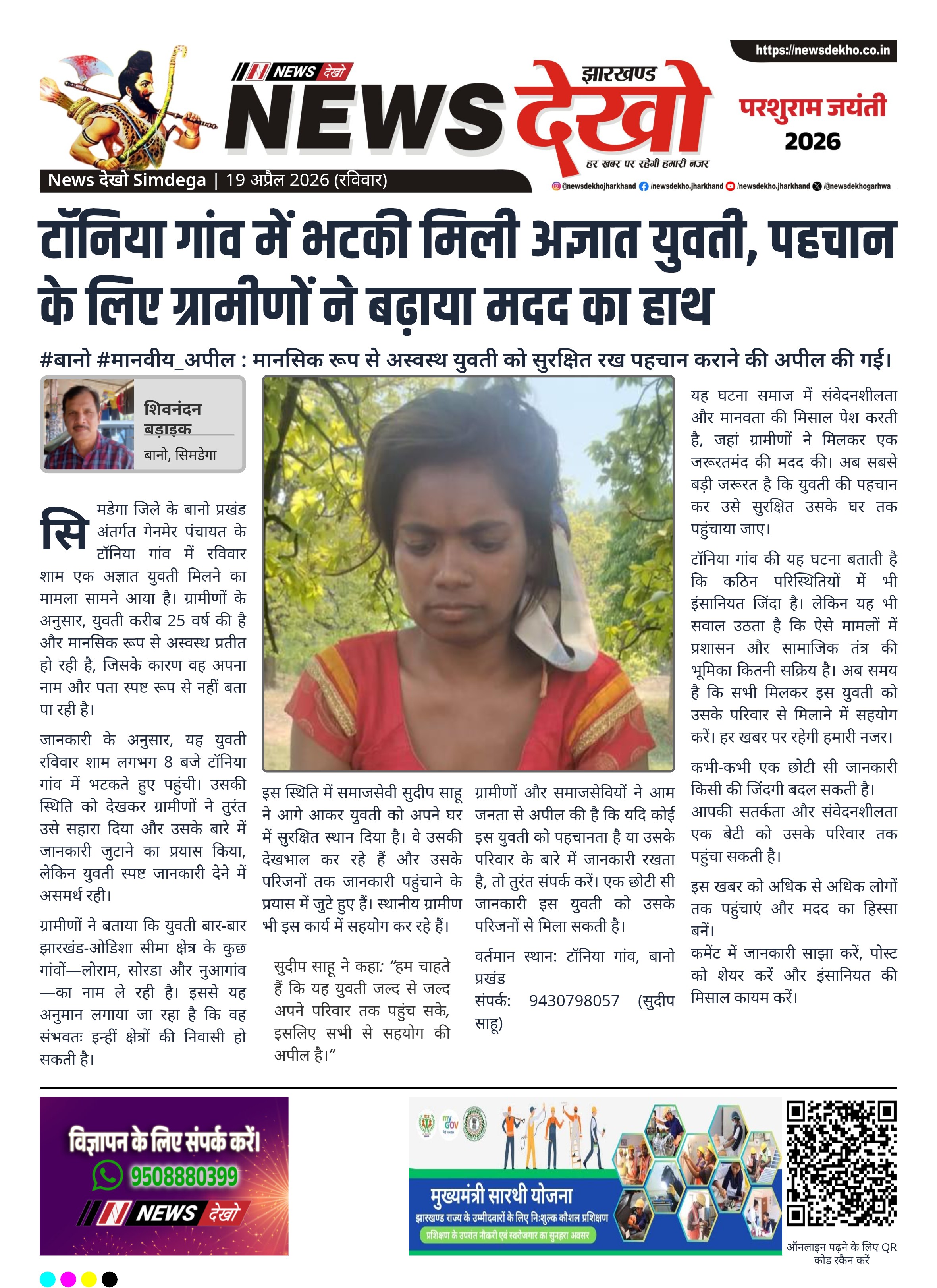 सिमडेगा जिले के बानो प्रखंड के टॉनिया गांव में एक अज्ञात युवती मिलने से क्षेत्र में चर्चा है। युवती अपनी पहचान स्पष्ट नहीं बता पा रही है और मानसिक रूप से अस्थिर बताई जा रही है। ग्रामीणों और समाजसेवी ने उसे सुरक्षित रखा है। लोगों से उसकी पहचान कराने की अपील की गई है।