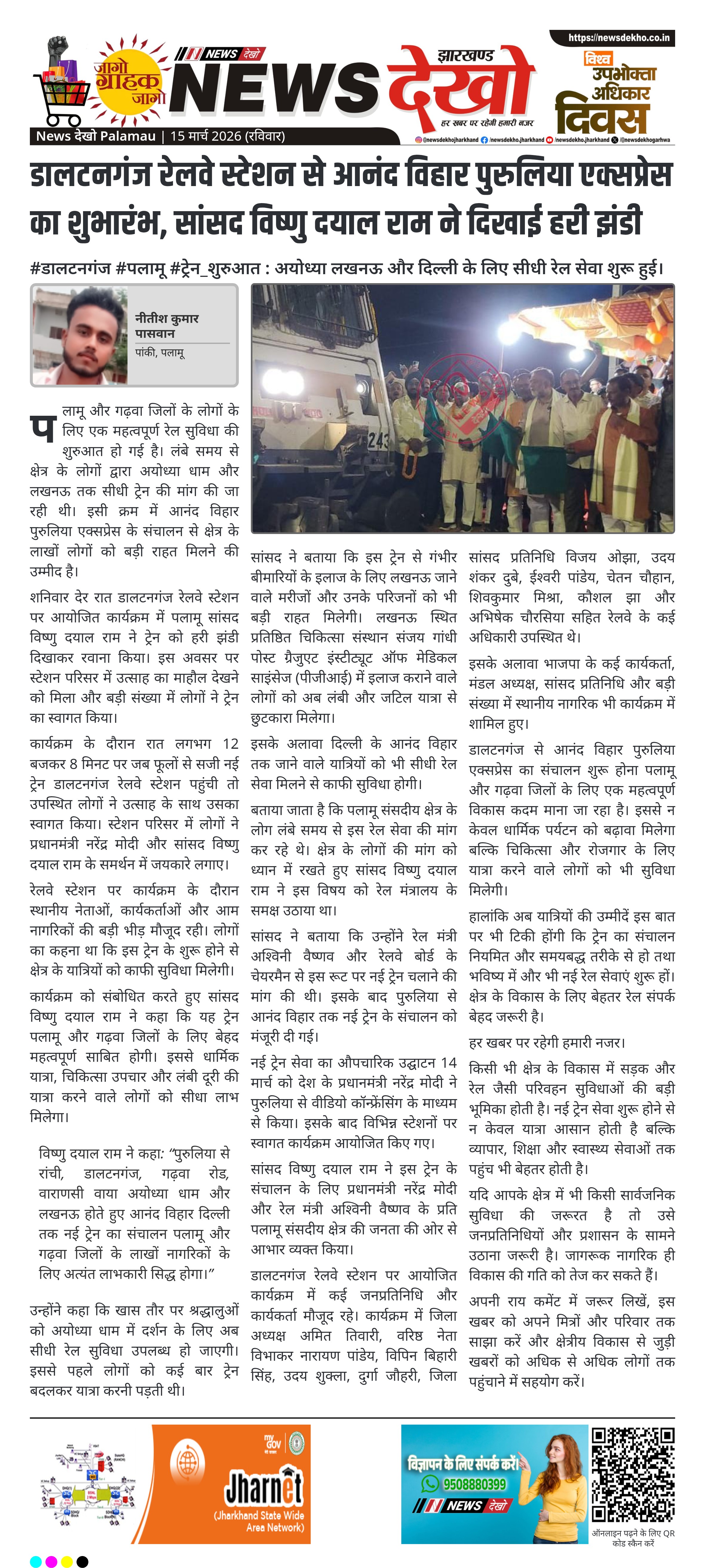 - पलामू सांसद विष्णु दयाल राम ने डालटनगंज रेलवे स्टेशन से नई ट्रेन को हरी झंडी दिखाई।