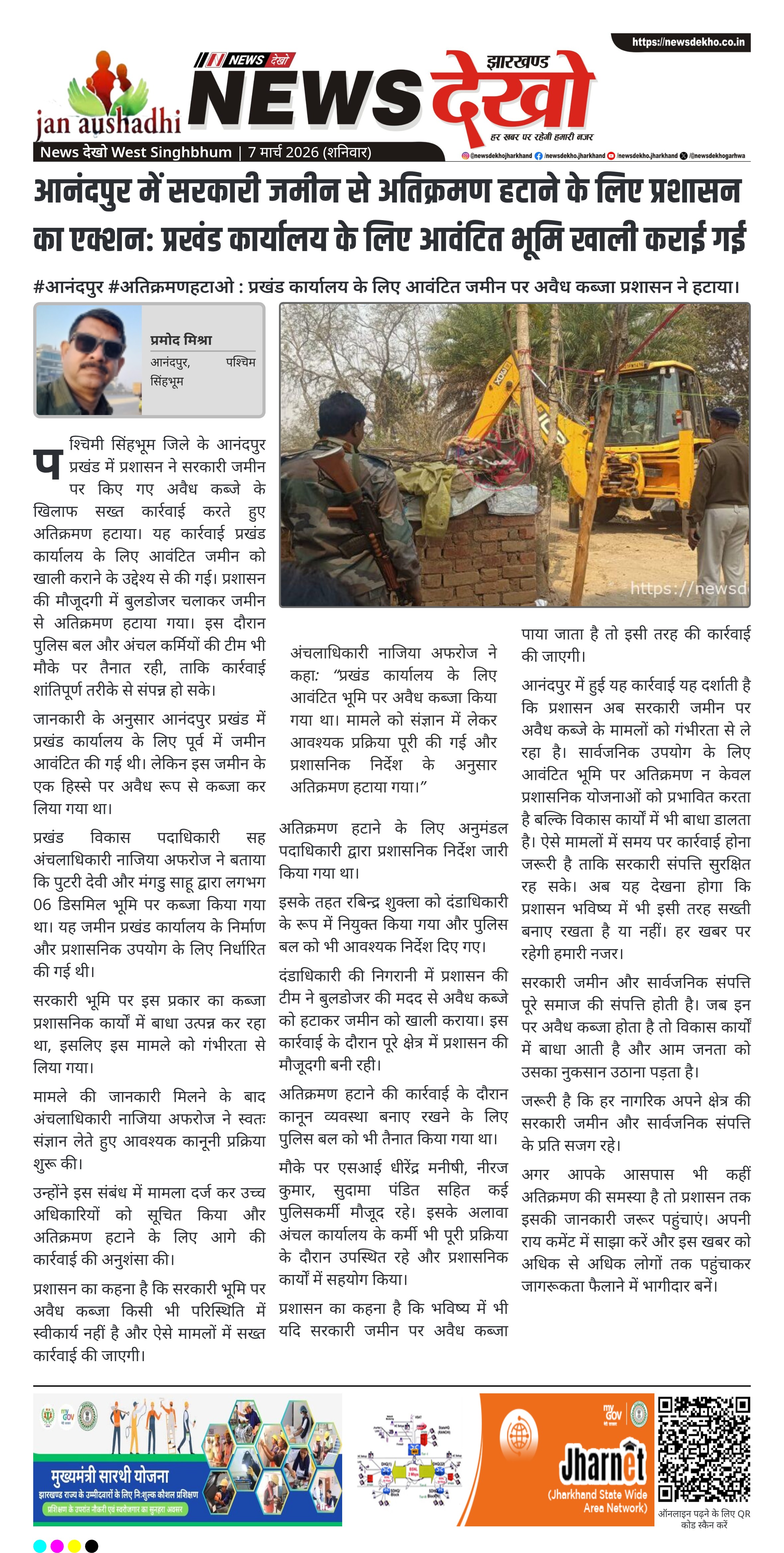 - पश्चिमी सिंहभूम के आनंदपुर में प्रशासन ने सरकारी जमीन से अतिक्रमण हटाया।