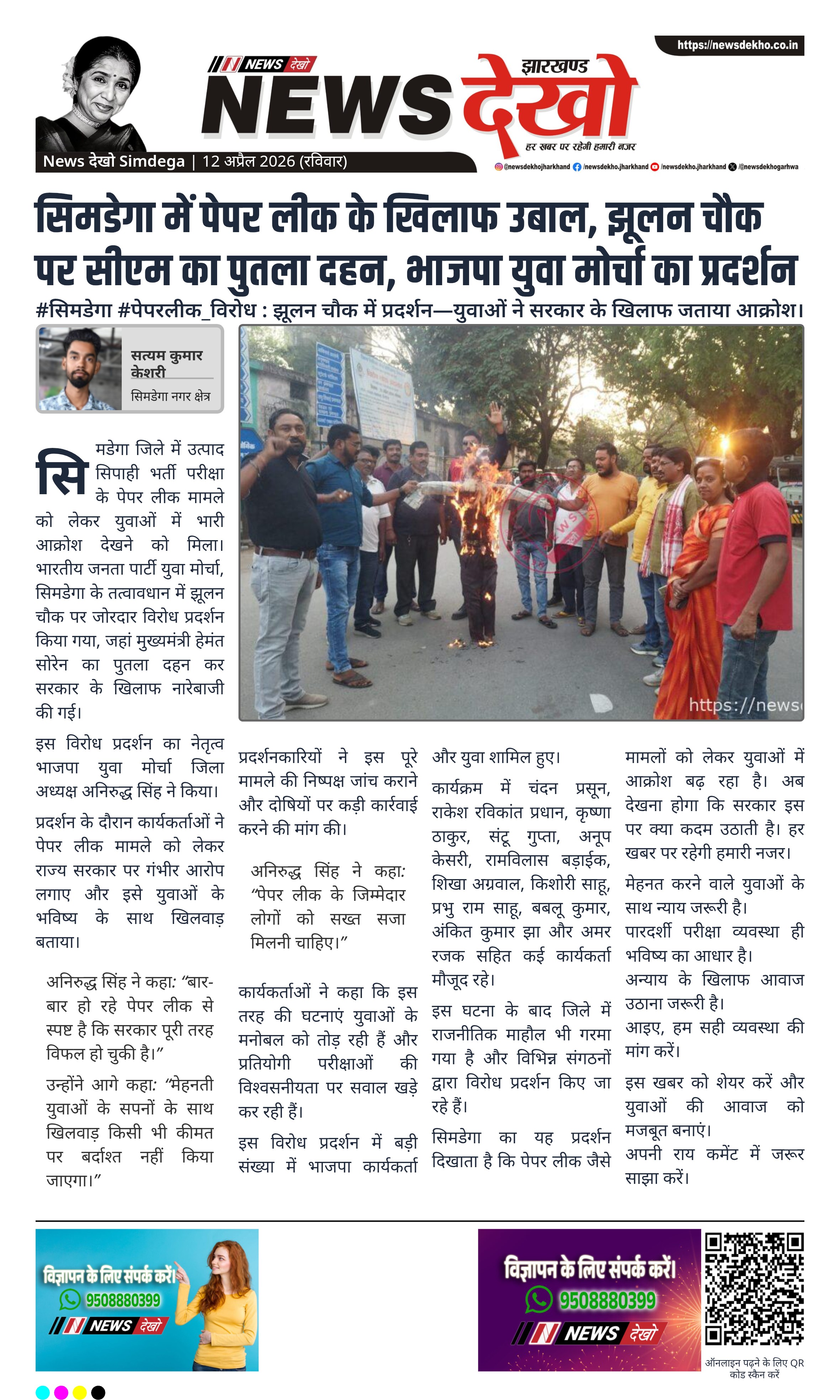 सिमडेगा का यह प्रदर्शन दिखाता है कि पेपर लीक जैसे मामलों को लेकर युवाओं में आक्रोश बढ़ रहा है। अब देखना होगा कि सरकार इस पर क्या कदम उठाती है। हर खबर पर रहेगी हमारी नजर।