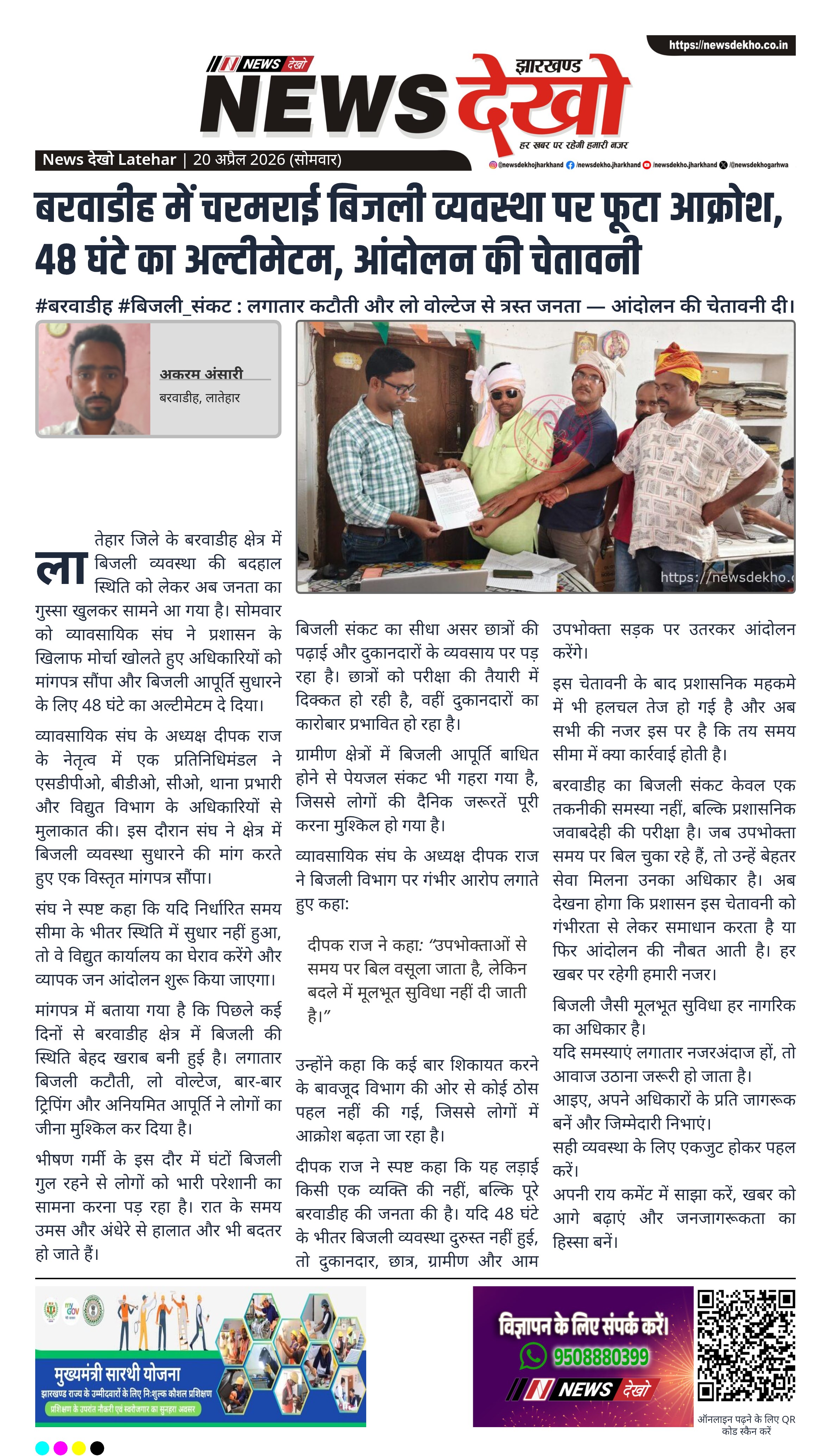 दीपक राज ने स्पष्ट कहा कि यह लड़ाई किसी एक व्यक्ति की नहीं, बल्कि पूरे बरवाडीह की जनता की है। यदि 48 घंटे के भीतर बिजली व्यवस्था दुरुस्त नहीं हुई, तो दुकानदार, छात्र, ग्रामीण और आम उपभोक्ता सड़क पर उतरकर आंदोलन करेंगे।