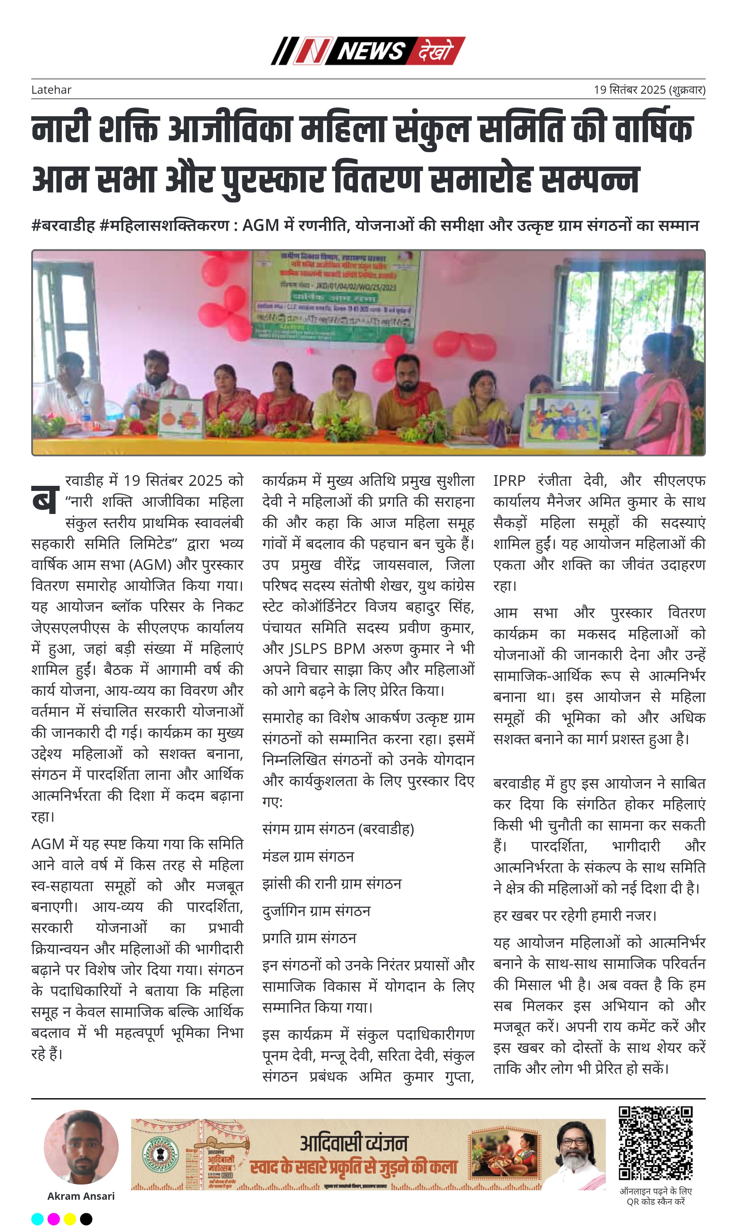 बरवाडीह में 19 सितंबर 2025 को “नारी शक्ति आजीविका महिला संकुल स्तरीय प्राथमिक स्वावलंबी सहकारी समिति लिमिटेड” द्वारा भव्य वार्षिक आम सभा (AGM) और पुरस्कार वितरण समारोह आयोजित किया गया। यह आयोजन ब्लॉक परिसर के निकट जेएसएलपीएस के सीएलएफ कार्यालय में हुआ, जहां बड़ी संख्या में महिलाएं शामिल हुईं। बैठक में आगामी वर्ष की कार्य योजना, आय-व्यय का विवरण और वर्तमान में संचालित सरकारी योजनाओं की जानकारी दी गई। कार्यक्रम का मुख्य उद्देश्य महिलाओं को सशक्त बनाना, संगठन में पारदर्शिता लाना और आर्थिक आत्मनिर्भरता की दिशा में कदम बढ़ाना रहा।