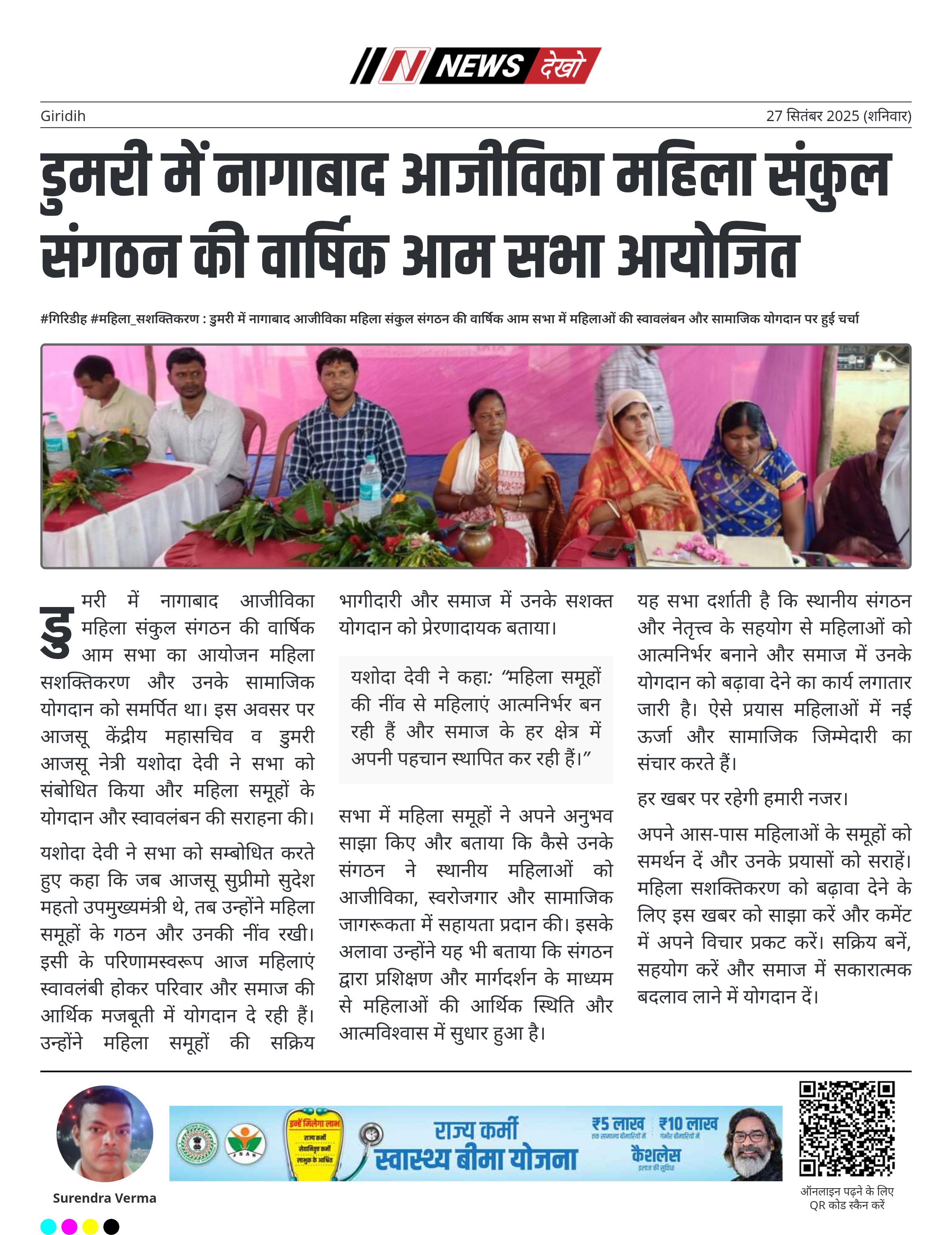 डुमरी में नागाबाद आजीविका महिला संकुल संगठन की वार्षिक आम सभा का आयोजन महिला सशक्तिकरण और उनके सामाजिक योगदान को समर्पित था। इस अवसर पर आजसू केंद्रीय महासचिव व डुमरी आजसू नेत्री यशोदा देवी ने सभा को संबोधित किया और महिला समूहों के योगदान और स्वावलंबन की सराहना की।