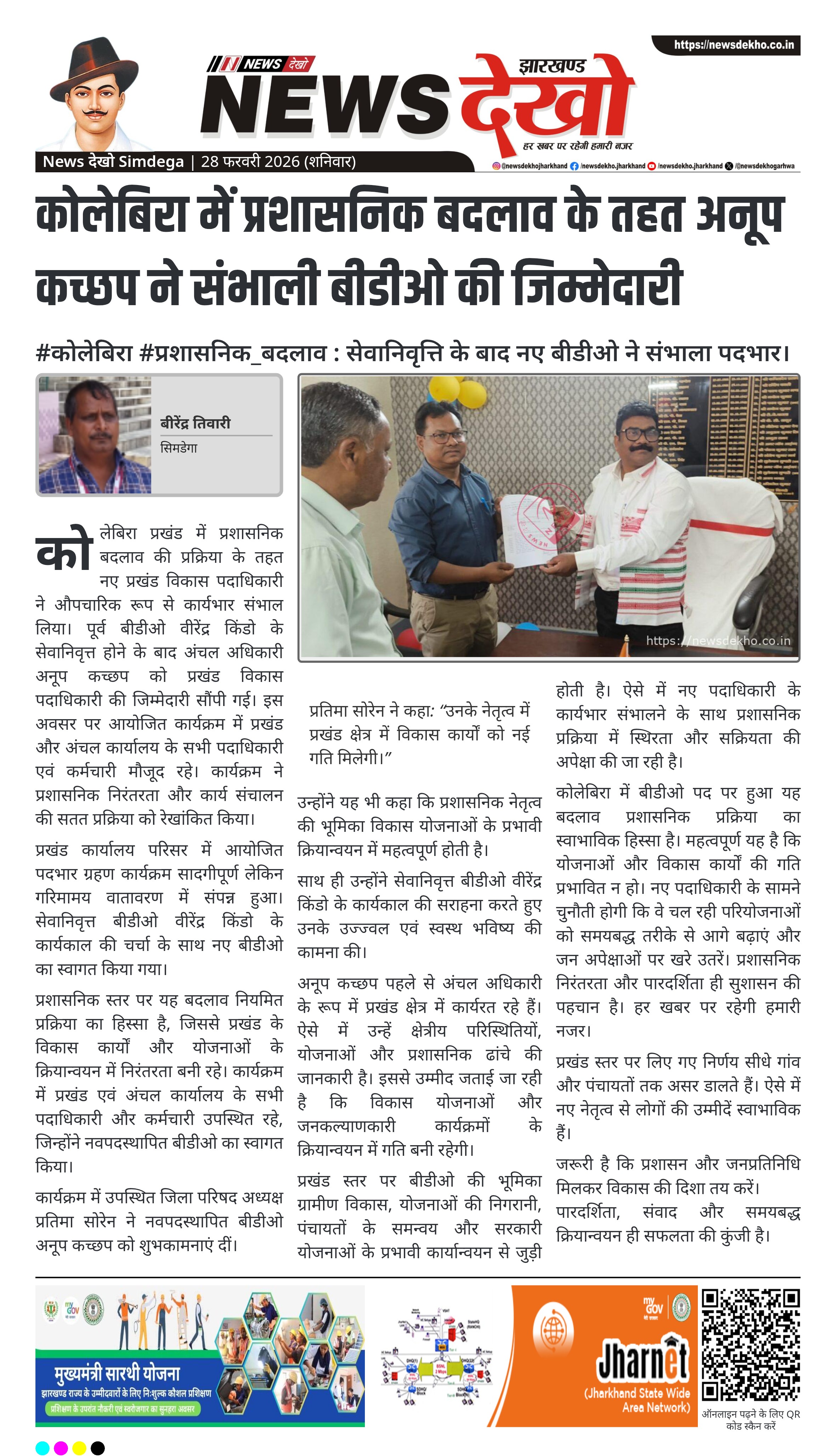 कोलेबिरा प्रखंड में प्रशासनिक बदलाव के तहत वीरेंद्र किंडो के सेवानिवृत्त होने के बाद अंचल अधिकारी अनूप कच्छप ने प्रखंड विकास पदाधिकारी का पदभार ग्रहण किया। पदभार ग्रहण कार्यक्रम में प्रखंड एवं अंचल कार्यालय के पदाधिकारी और कर्मचारी उपस्थित रहे। जिला परिषद अध्यक्ष प्रतिमा सोरेन ने नवपदस्थापित बीडीओ को शुभकामनाएं दीं। इस बदलाव को प्रखंड प्रशासन की निरंतरता और विकास कार्यों की गति से जोड़ा जा रहा है।