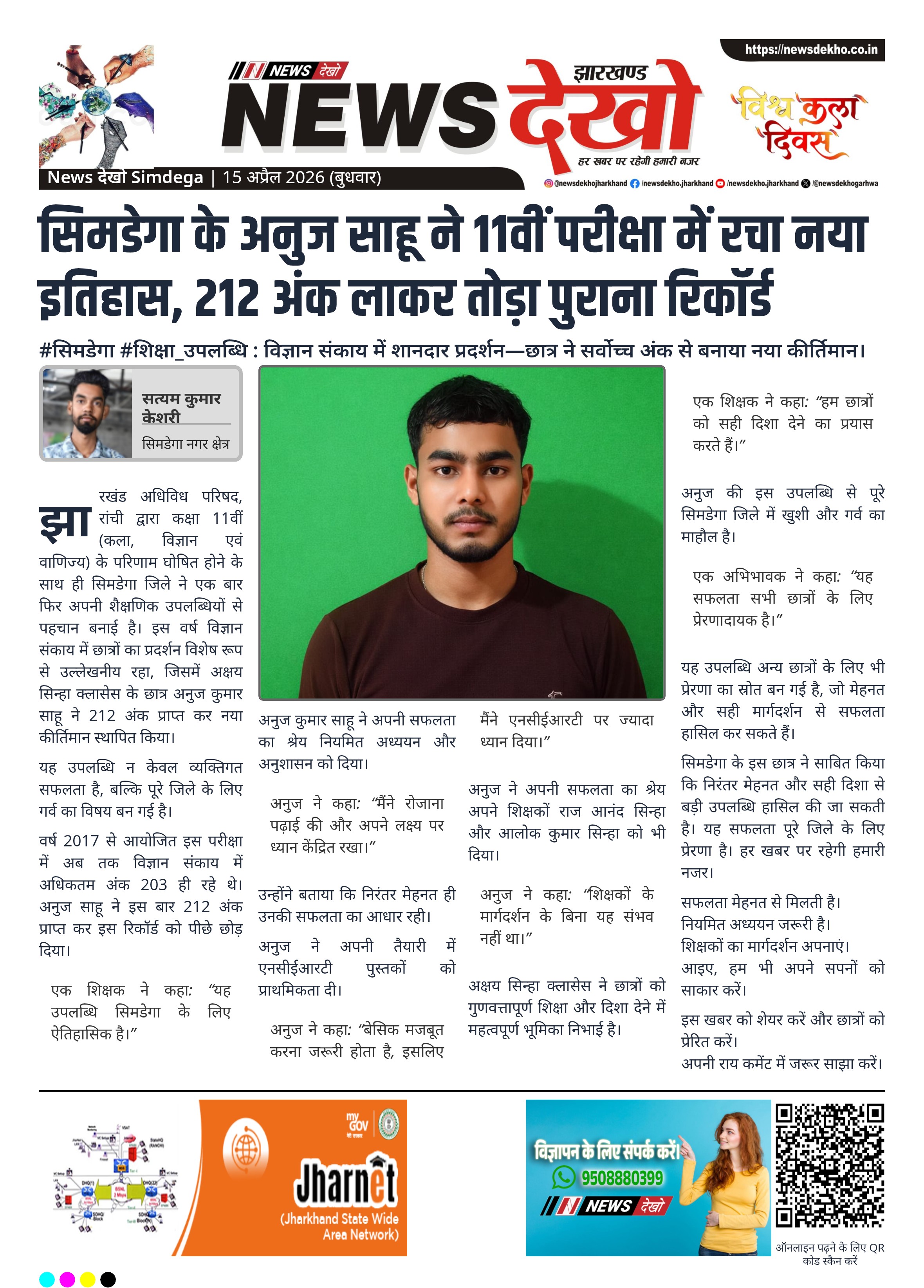 सिमडेगा के छात्र अनुज कुमार साहू ने कक्षा 11वीं परीक्षा में 212 अंक हासिल कर नया रिकॉर्ड बनाया है। झारखंड अधिविध परिषद के परिणाम में यह अब तक का सर्वोच्च अंक है। उनकी सफलता से जिले में उत्साह का माहौल है। शिक्षकों और कोचिंग का योगदान अहम माना गया है।
