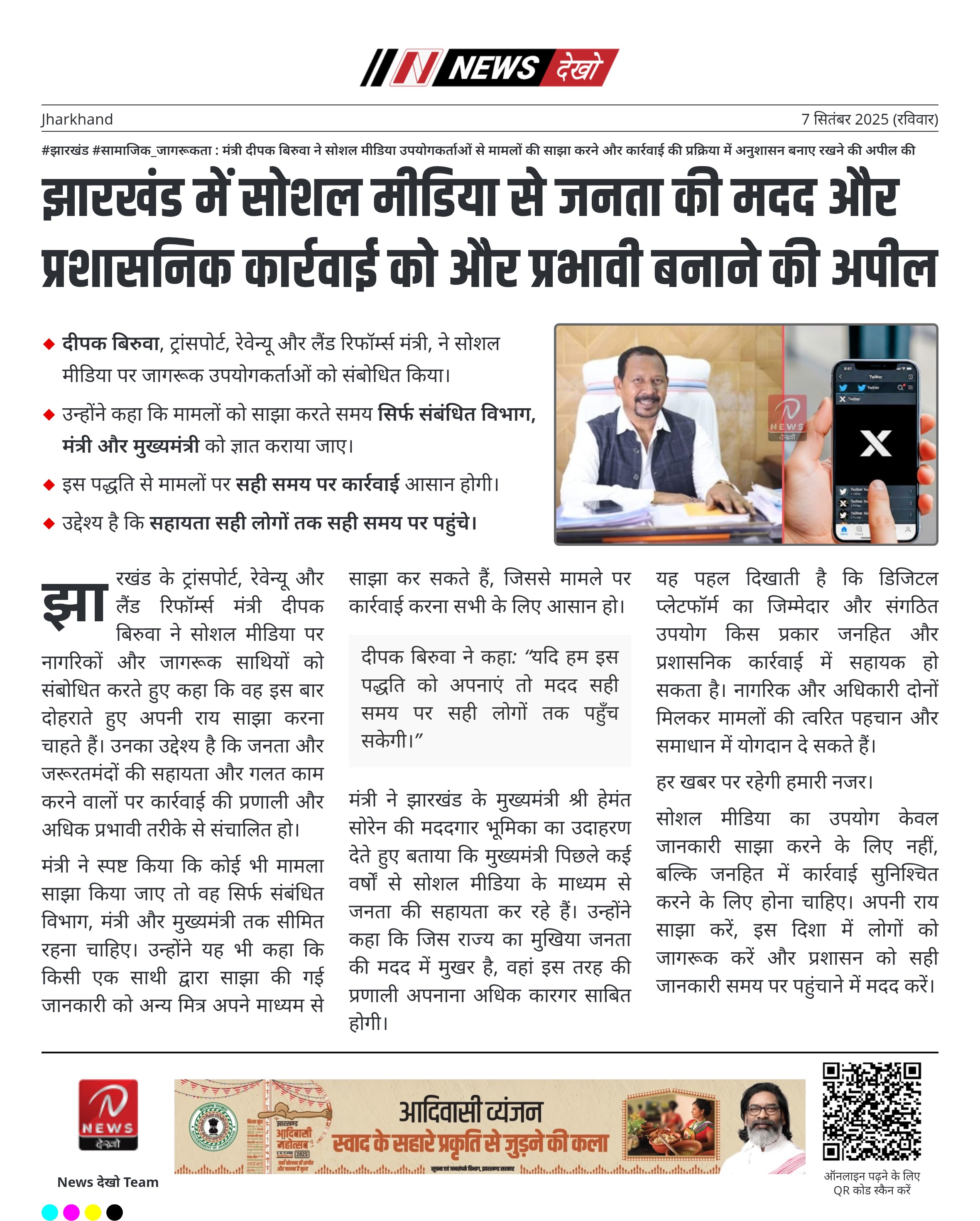 #झारखंड #सामाजिक_जागरूकता : मंत्री दीपक बिरुवा ने सोशल मीडिया उपयोगकर्ताओं से मामलों की साझा करने और कार्रवाई की प्रक्रिया में अनुशासन बनाए रखने की अपील की