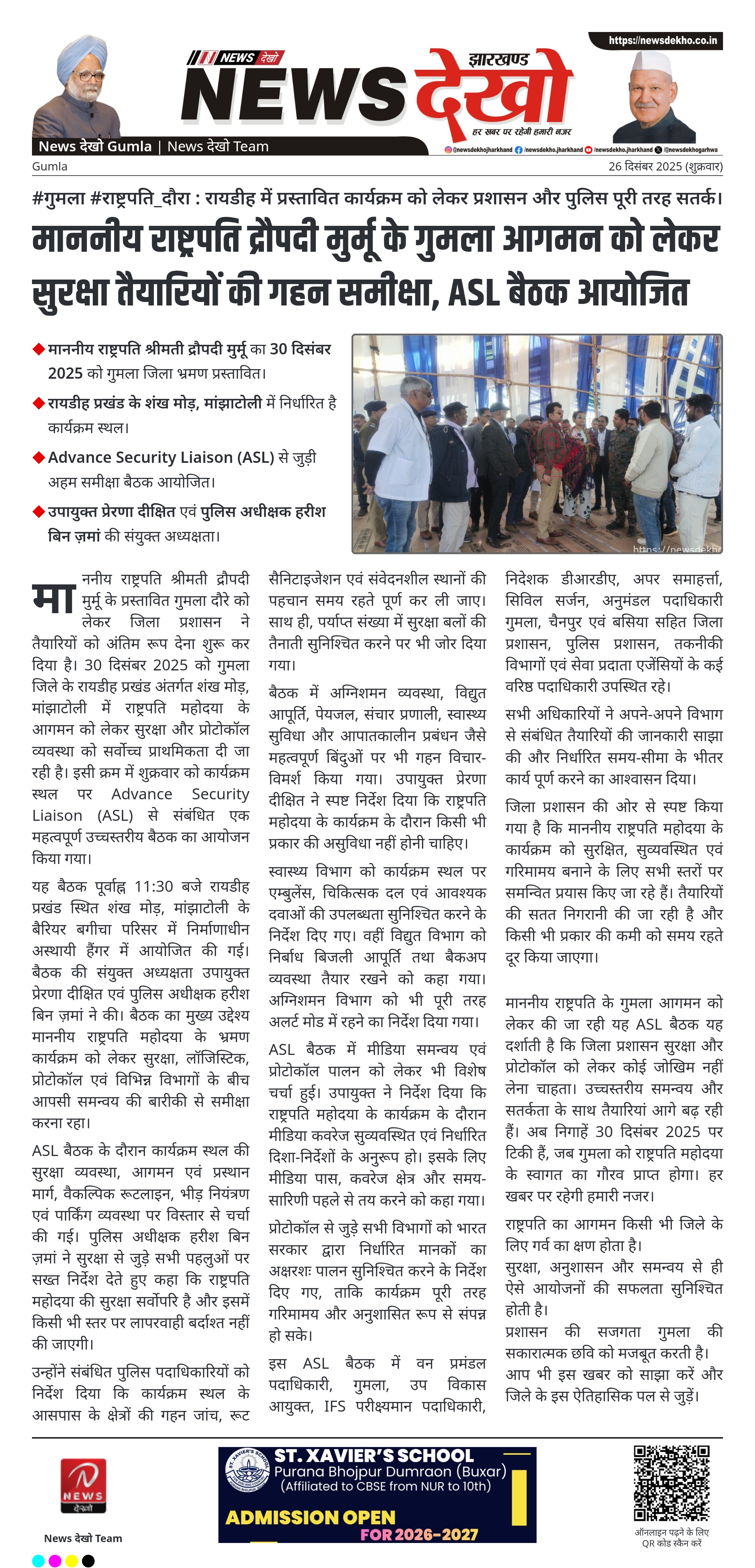 - माननीय राष्ट्रपति श्रीमती द्रौपदी मुर्मू का 30 दिसंबर 2025 को गुमला जिला भ्रमण प्रस्तावित।
