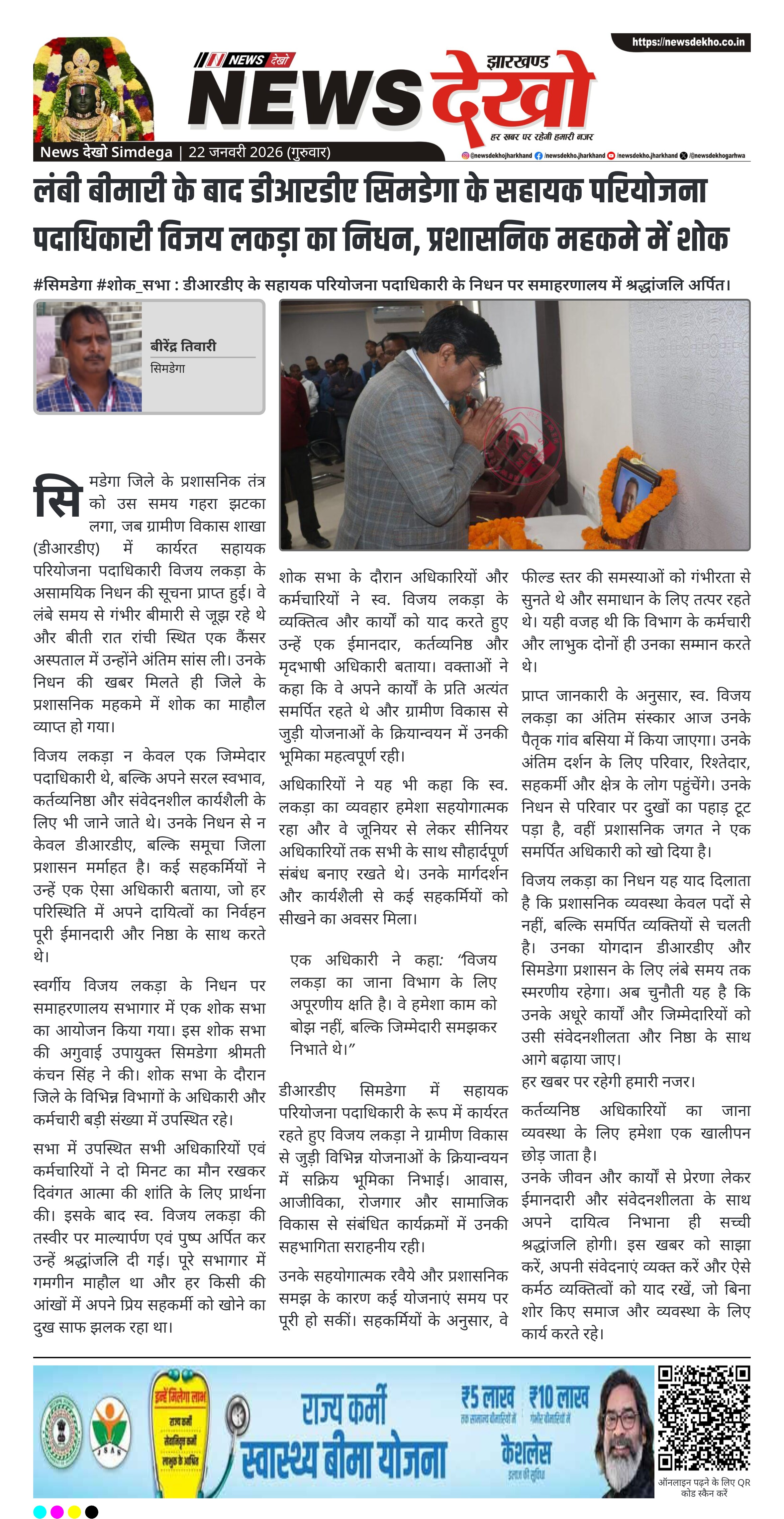 विजय लकड़ा का निधन यह याद दिलाता है कि प्रशासनिक व्यवस्था केवल पदों से नहीं, बल्कि समर्पित व्यक्तियों से चलती है। उनका योगदान डीआरडीए और सिमडेगा प्रशासन के लिए लंबे समय तक स्मरणीय रहेगा। अब चुनौती यह है कि उनके अधूरे कार्यों और जिम्मेदारियों को उसी संवेदनशीलता और निष्ठा के साथ आगे बढ़ाया जाए।