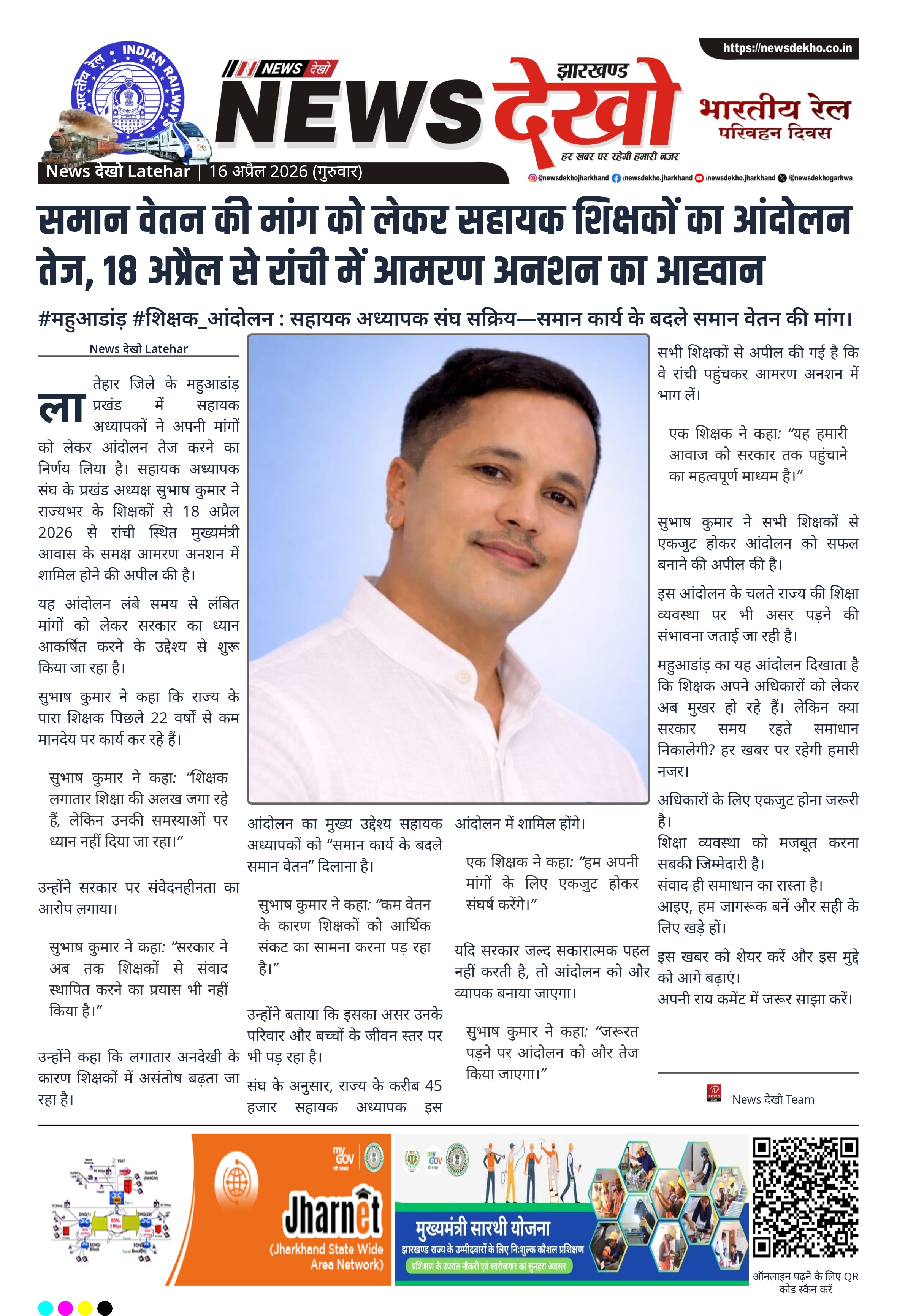 लातेहार जिले के महुआडांड़ प्रखंड में सहायक अध्यापकों ने अपनी मांगों को लेकर आंदोलन तेज करने का निर्णय लिया है। सहायक अध्यापक संघ के प्रखंड अध्यक्ष सुभाष कुमार ने राज्यभर के शिक्षकों से 18 अप्रैल 2026 से रांची स्थित मुख्यमंत्री आवास के समक्ष आमरण अनशन में शामिल होने की अपील की है।