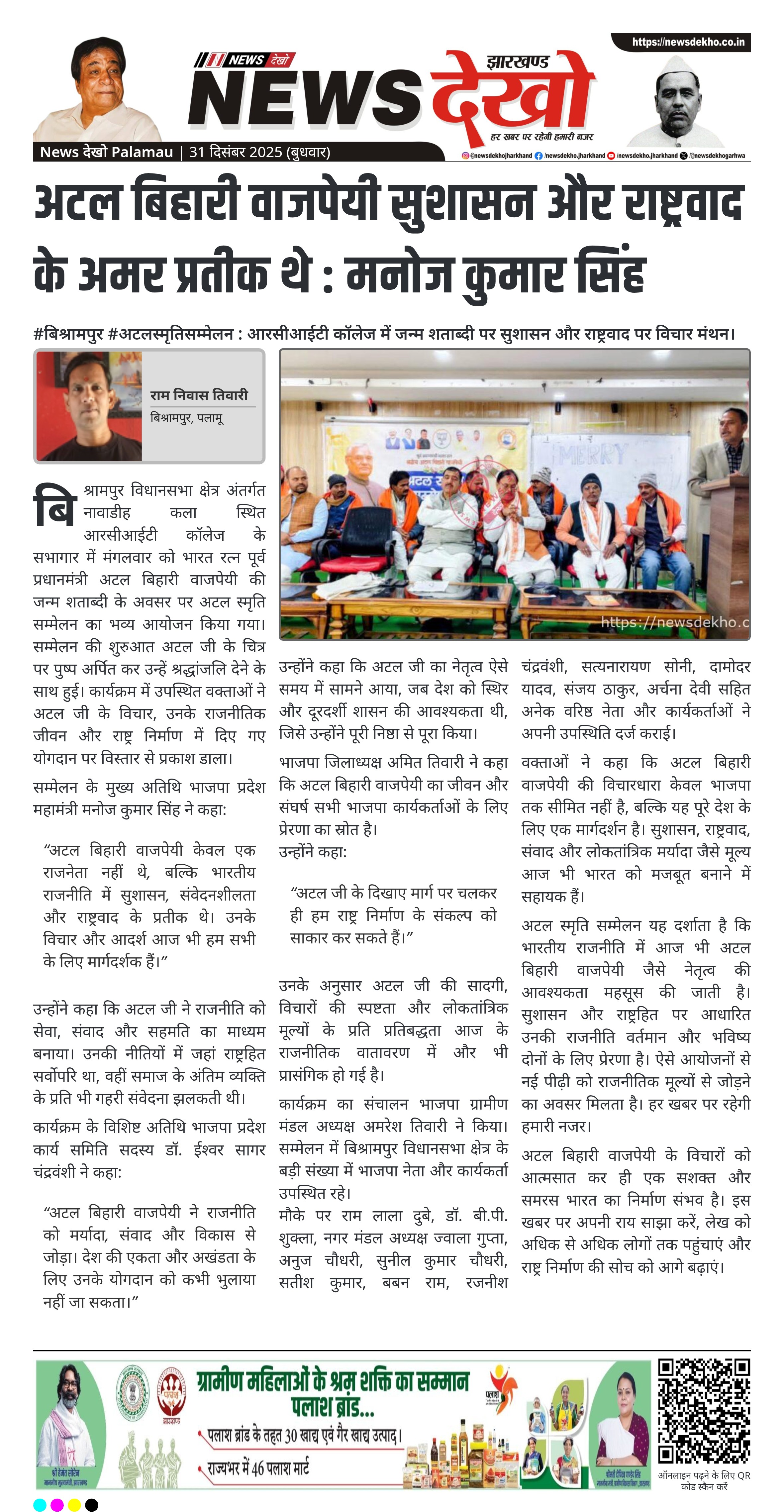 बिश्रामपुर के आरसीआईटी कॉलेज परिसर में भारत रत्न अटल बिहारी वाजपेयी की जन्म शताब्दी के अवसर पर अटल स्मृति सम्मेलन का आयोजन किया गया। सम्मेलन में भाजपा नेताओं और कार्यकर्ताओं ने अटल जी के सुशासन, राष्ट्रवाद और लोकतांत्रिक मूल्यों पर विस्तार से चर्चा की। कार्यक्रम में अटल जी को श्रद्धांजलि अर्पित करते हुए उनके विचारों को आज के भारत के लिए प्रासंगिक बताया गया। यह आयोजन राजनीतिक मर्यादा और राष्ट्र निर्माण के संदेश के रूप में महत्वपूर्ण रहा।