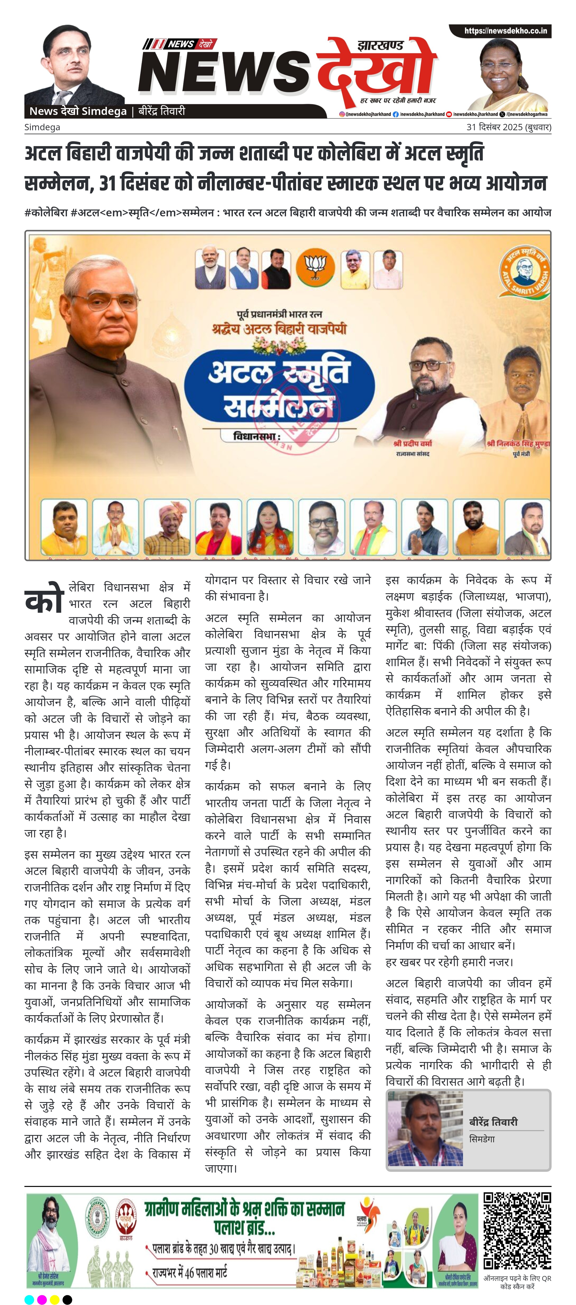 कोलेबिरा विधानसभा क्षेत्र में भारत रत्न एवं पूर्व प्रधानमंत्री श्रद्धेय अटल बिहारी वाजपेयी की जन्म शताब्दी स्मृति में अटल स्मृति सम्मेलन का आयोजन किया जा रहा है। यह सम्मेलन 31 दिसंबर 2025 को सुबह 11 बजे नीलाम्बर-पीतांबर स्मारक स्थल, कोलेबिरा में आयोजित होगा। कार्यक्रम में झारखंड सरकार के पूर्व मंत्री नीलकंठ सिंह मुंडा मुख्य वक्ता के रूप में शामिल होंगे। आयोजन का उद्देश्य अटल बिहारी वाजपेयी के विचारों, राष्ट्र निर्माण में उनके योगदान और लोकतांत्रिक मूल्यों को जन-जन तक पहुंचाना है।