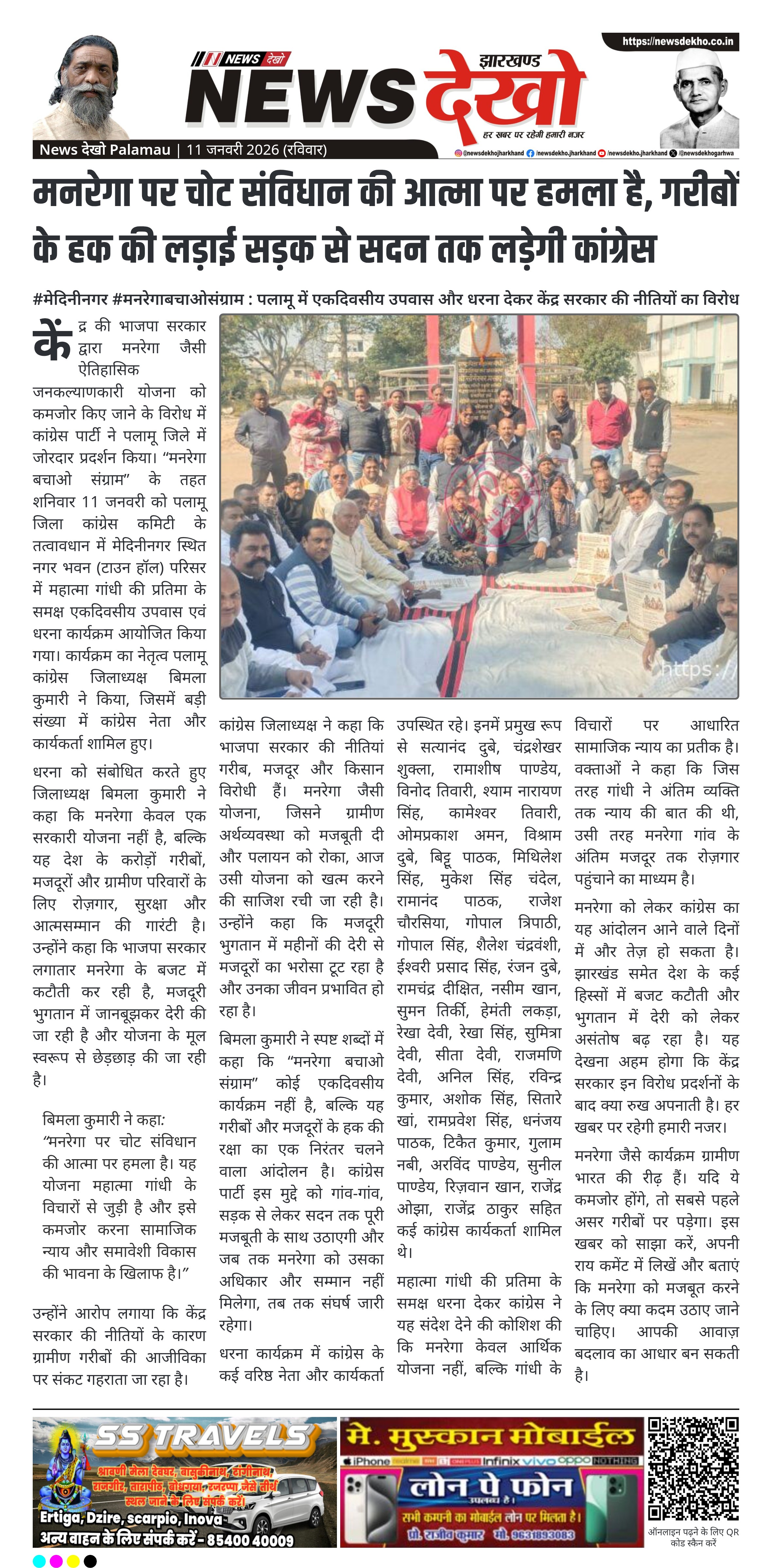 केंद्र की भाजपा सरकार द्वारा मनरेगा जैसी ऐतिहासिक जनकल्याणकारी योजना को कमजोर किए जाने के विरोध में कांग्रेस पार्टी ने पलामू जिले में जोरदार प्रदर्शन किया। “मनरेगा बचाओ संग्राम” के तहत शनिवार 11 जनवरी को पलामू जिला कांग्रेस कमिटी के तत्वावधान में मेदिनीनगर स्थित नगर भवन (टाउन हॉल) परिसर में महात्मा गांधी की प्रतिमा के समक्ष एकदिवसीय उपवास एवं धरना कार्यक्रम आयोजित किया गया। कार्यक्रम का नेतृत्व पलामू कांग्रेस जिलाध्यक्ष बिमला कुमारी ने किया, जिसमें बड़ी संख्या में कांग्रेस नेता और कार्यकर्ता शामिल हुए।