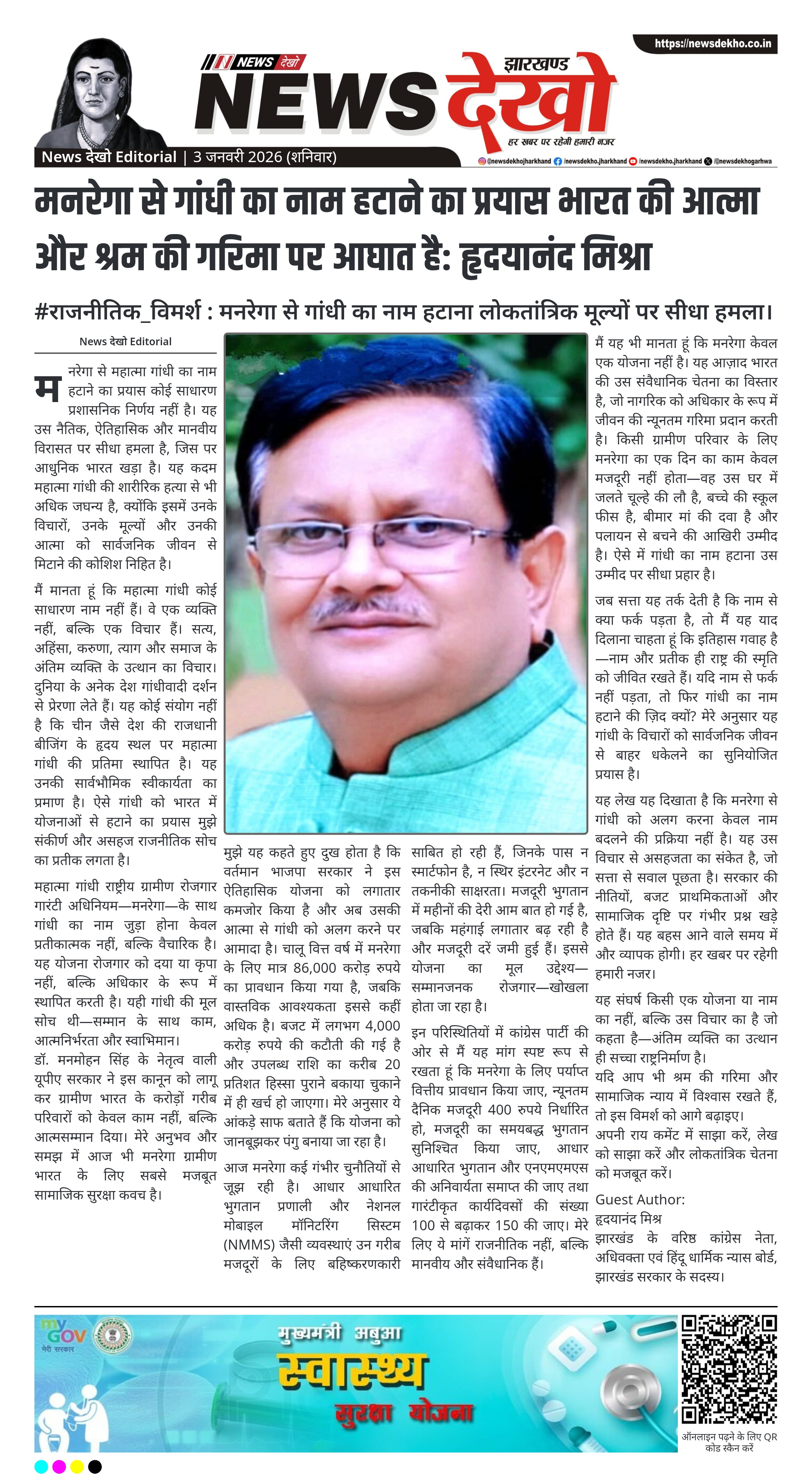 मैं, हृदयानंद मिश्र, मनरेगा से महात्मा गांधी का नाम हटाने के प्रयास को केवल प्रशासनिक बदलाव नहीं मानता। मेरे लिए यह भारतीय लोकतंत्र की नैतिक, ऐतिहासिक और मानवीय आत्मा पर सीधा आघात है। यह विषय ग्रामीण भारत, श्रम के अधिकार और संवैधानिक चेतना से गहराई से जुड़ा है। गांधी के नाम को अलग करना उस विचार को कमजोर करने का प्रयास है, जिस पर यह योजना आधारित है।