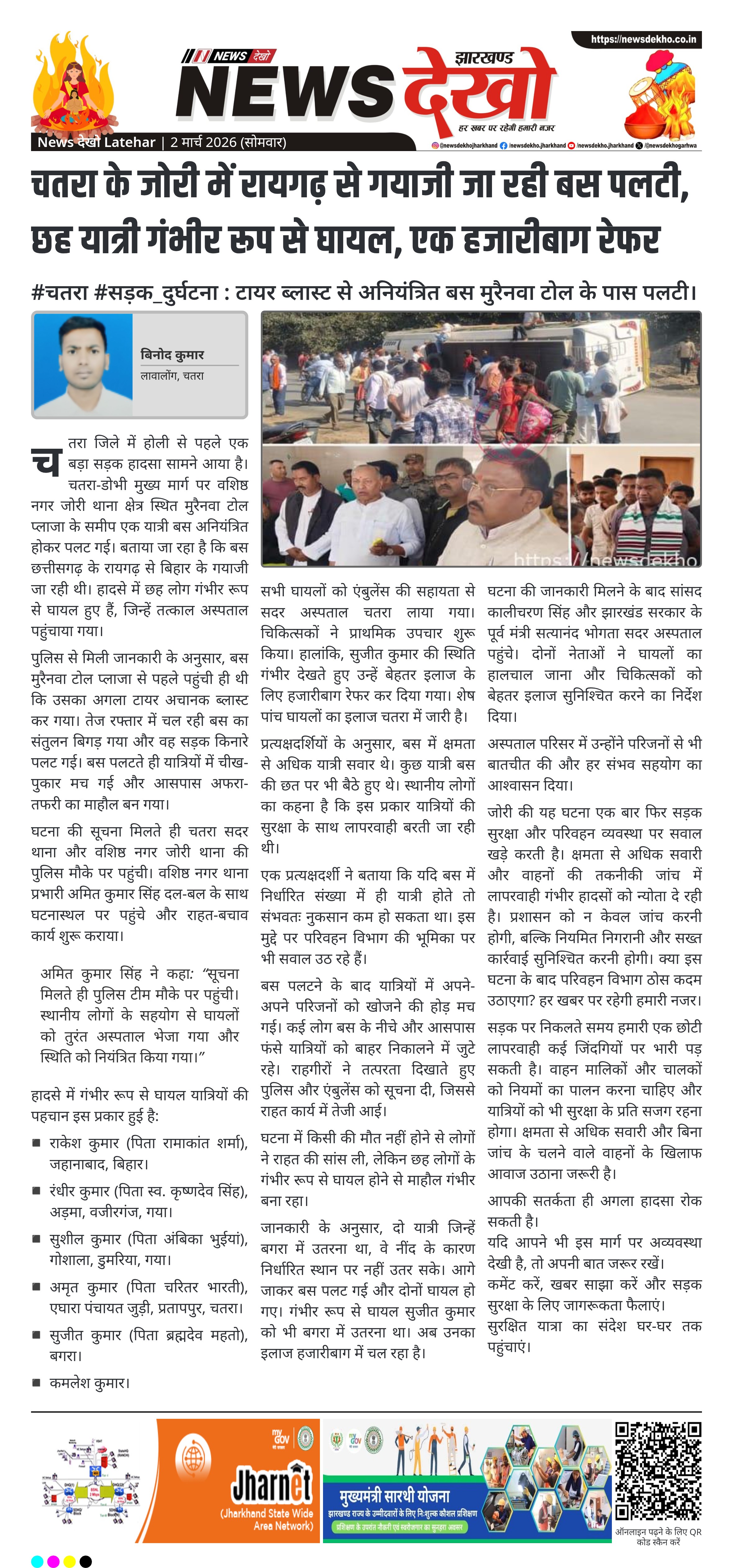 #चतरा #सड़क_दुर्घटना : टायर ब्लास्ट से अनियंत्रित बस मुरैनवा टोल के पास पलटी। मुरैनवा टोल प्लाजा, जोरी थाना क्षेत्र के पास हादसा। रायगढ़ से गयाजी जा रही थी यात्री बस। लगभग छह यात्री गंभीर रूप से घायल। सुजीत कुमार को हजारीबाग रेफर किया गया। बस में क्षमता से अधिक सवारी होने का आरोप। चतरा जिले में होली से पहले एक बड़ा सड़क हादसा सामने आया है। चतरा-डोभी मुख्य मार्ग पर वशिष्ठ नगर जोरी थाना क्षेत्र स्थित मुरैनवा टोल प्लाजा के…