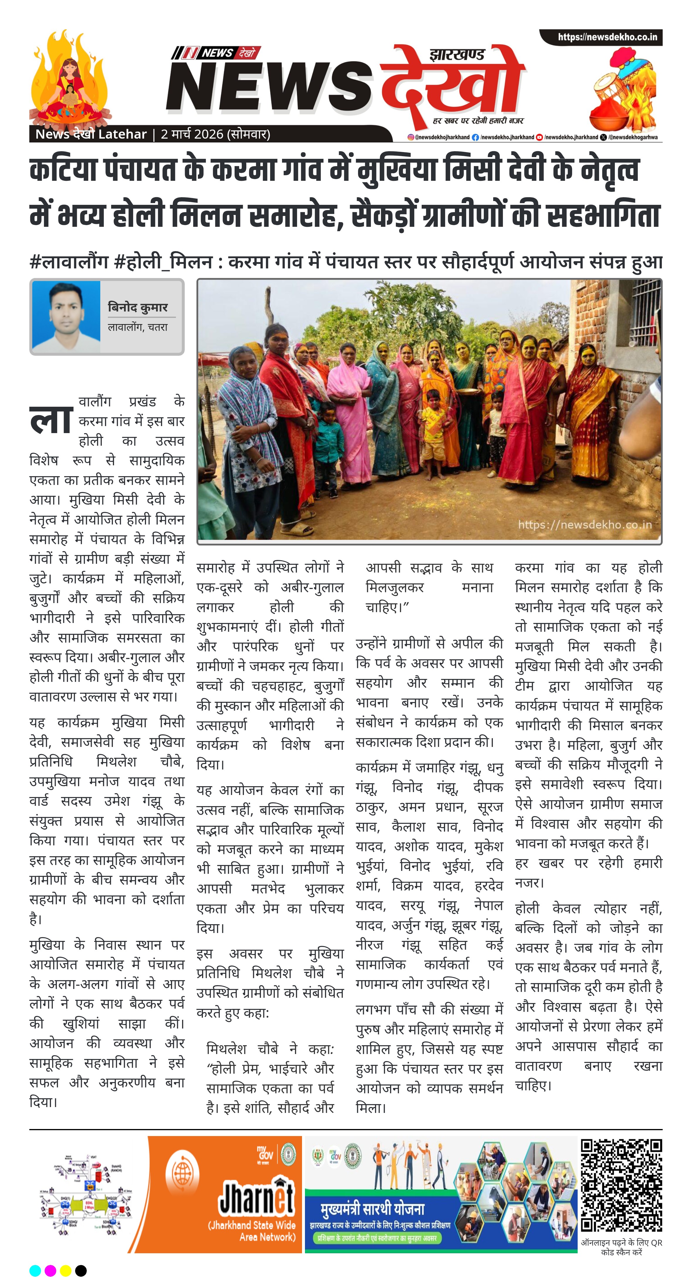 #लावालौंग #होली_मिलन : करमा गांव में पंचायत स्तर पर सौहार्दपूर्ण आयोजन संपन्न हुआ। कटिया पंचायत के करमा गांव में आयोजित हुआ समारोह। मुखिया मिसी देवी के नेतृत्व में हुआ आयोजन। लगभग पाँच सौ ग्रामीणों की रही भागीदारी। महिला, बुजुर्ग और बच्चों की उल्लेखनीय उपस्थिति। मुखिया प्रतिनिधि मिथलेश चौबे ने शांति और सौहार्द का संदेश दिया। लावालौंग प्रखंड के करमा गांव में इस बार होली का उत्सव विशेष रूप से सामुदायिक एकता का प्रतीक बनकर सामने आया। मुखिया मिसी देवी के…