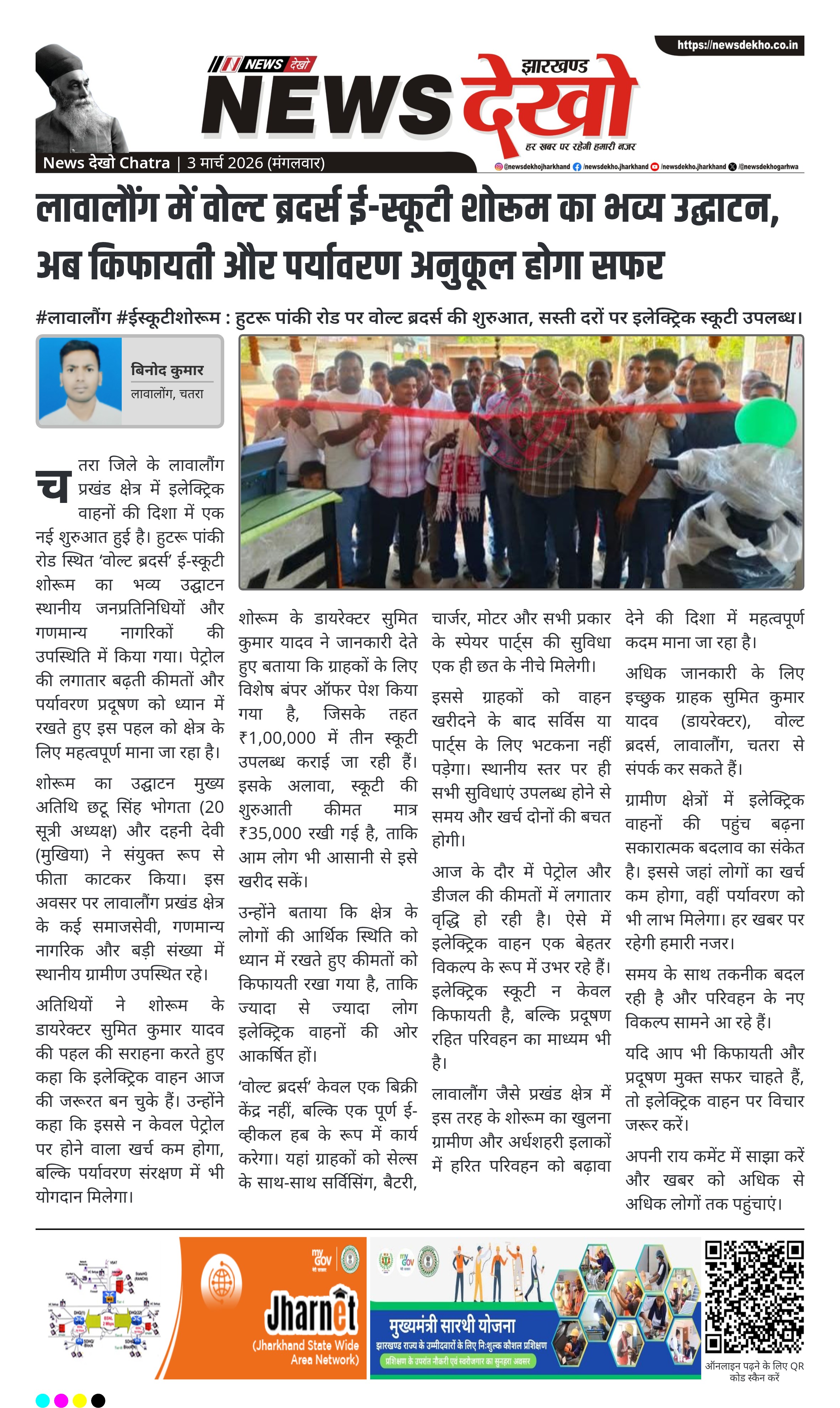 #लावालौंग #ईस्कूटीशोरूम : हुटरू पांकी रोड पर वोल्ट ब्रदर्स की शुरुआत, सस्ती दरों पर इलेक्ट्रिक स्कूटी उपलब्ध। हुटरू पांकी रोड, लावालौंग में खुला ‘वोल्ट ब्रदर्स’ ई-स्कूटी शोरूम। उद्घाटन छटू सिंह भोगता (20 सूत्री अध्यक्ष) और दहनी देवी (मुखिया) ने किया। डायरेक्टर सुमित कुमार यादव ने पेश किया विशेष बंपर ऑफर। ₹35,000 की शुरुआती कीमत से उपलब्ध इलेक्ट्रिक स्कूटी। शोरूम में सेल्स, सर्विसिंग और स्पेयर पार्ट्स की एक ही छत के नीचे सुविधा। चतरा जिले के लावालौंग प्रखंड क्षेत्र में इलेक्ट्रिक…
