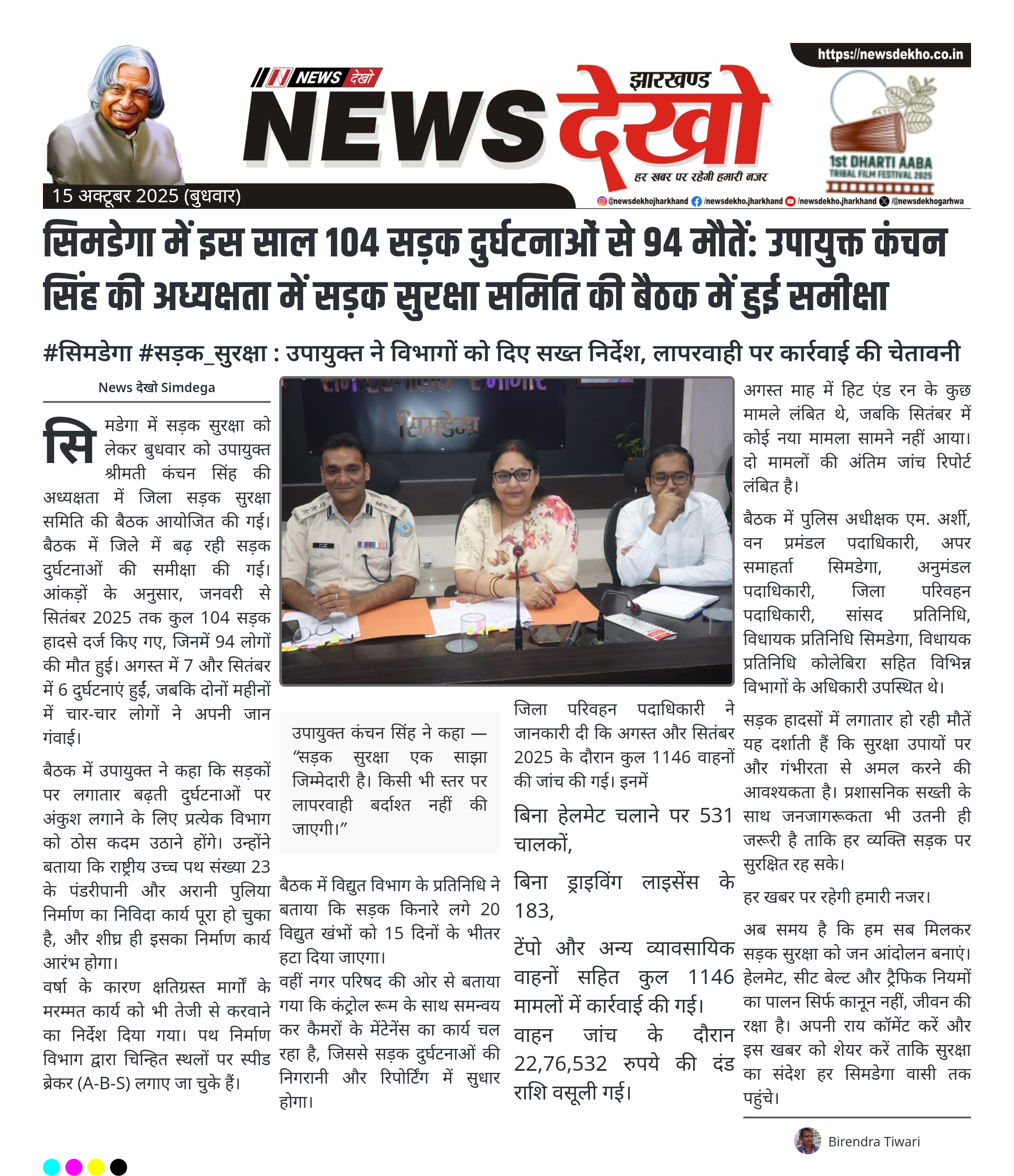 #सिमडेगा #सड़क_सुरक्षा : उपायुक्त ने विभागों को दिए सख्त निर्देश, लापरवाही पर कार्रवाई की चेतावनी जनवरी से सितंबर 2025 तक सिमडेगा में 104 सड़क दुर्घटनाएं दर्ज हुईं। 94 लोगों की मौत, जिनमें अगस्त और सितंबर में चार-चार की जान गई। राष्ट्रीय राजमार्ग-23 पर पुलिया निर्माण का टेंडर पूरा, जल्द होगा कार्यान्वयन। बिना हेलमेट और अनुज्ञप्ति के 714 वाहन चालक पकड़े गए। दंड के रूप में वसूले गए 22 लाख 76 हजार रुपये। सिमडेगा में सड़क सुरक्षा को लेकर बुधवार को…