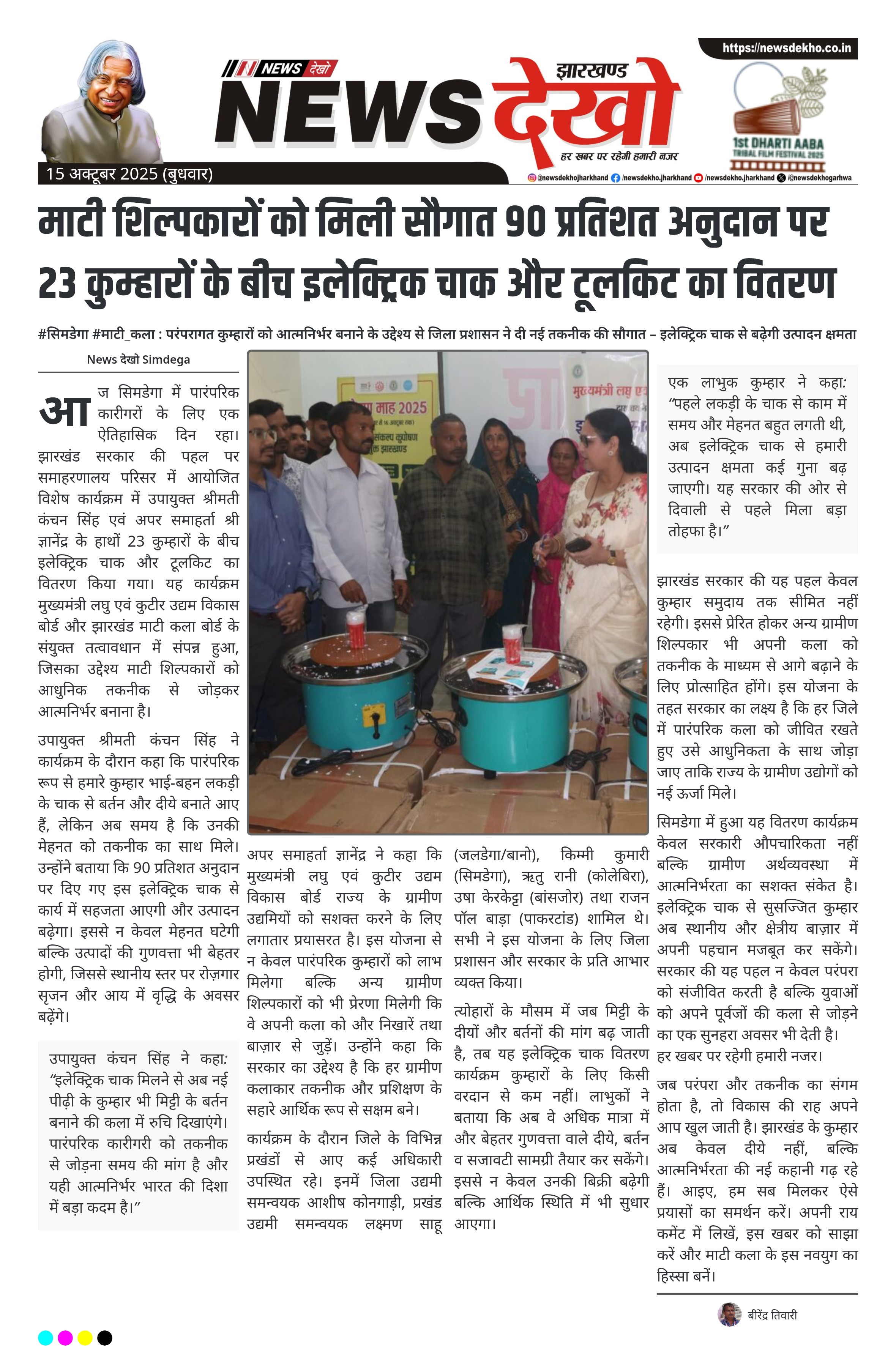 #सिमडेगा #माटी_कला : परंपरागत कुम्हारों को आत्मनिर्भर बनाने के उद्देश्य से जिला प्रशासन ने दी नई तकनीक की सौगात – इलेक्ट्रिक चाक से बढ़ेगी उत्पादन क्षमता और आय। समाहरणालय सिमडेगा परिसर में हुआ इलेक्ट्रिक चाक वितरण कार्यक्रम। 23 कुम्हारों को 90% अनुदान पर मिला इलेक्ट्रिक चाक और टूलकिट। उपायुक्त कंचन सिंह और अपर समाहर्ता ज्ञानेंद्र ने किया वितरण। झारखंड माटी कला बोर्ड और लघु एवं कुटीर उद्यम बोर्ड का संयुक्त आयोजन। तकनीकी उन्नयन से उत्पादन क्षमता और गुणवत्ता दोनों में…