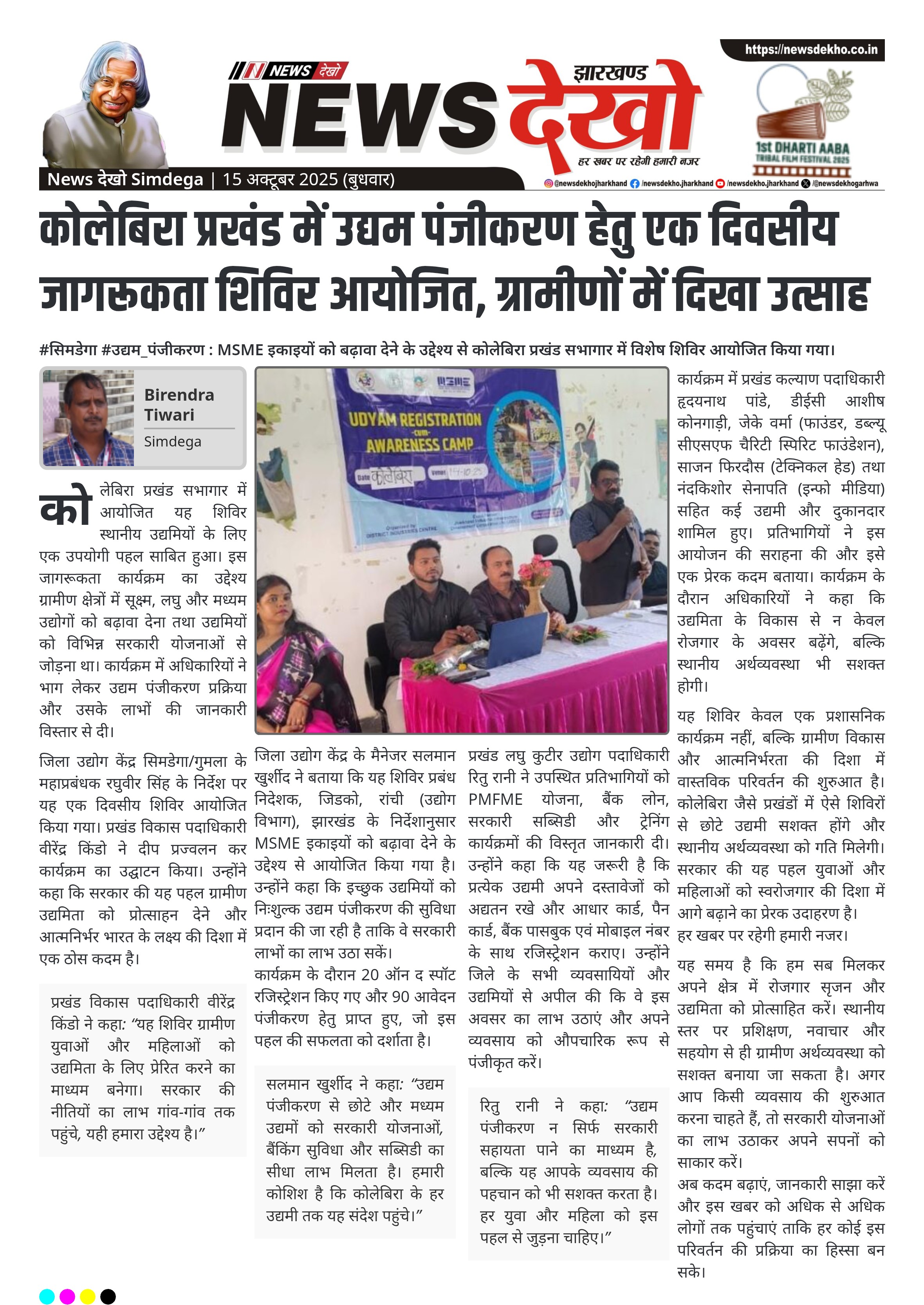 #सिमडेगा #उद्यम_पंजीकरण : MSME इकाइयों को बढ़ावा देने के उद्देश्य से कोलेबिरा प्रखंड सभागार में विशेष शिविर आयोजित किया गया। महाप्रबंधक जिला उद्योग केन्द्र रघुवीर सिंह के निर्देशानुसार शिविर का आयोजन हुआ। प्रखंड विकास पदाधिकारी वीरेंद्र किंडो ने दीप प्रज्वलन कर कार्यक्रम की शुरुआत की। जिला उद्योग केंद्र के मैनेजर सलमान खुर्शीद ने MSME इकाइयों के लाभ पर विस्तार से जानकारी दी। 20 ऑन द स्पॉट रजिस्ट्रेशन और 90 आवेदन रजिस्ट्रेशन हेतु लिए गए। प्रखंड लघु कुटीर उद्योग पदाधिकारी रितु…