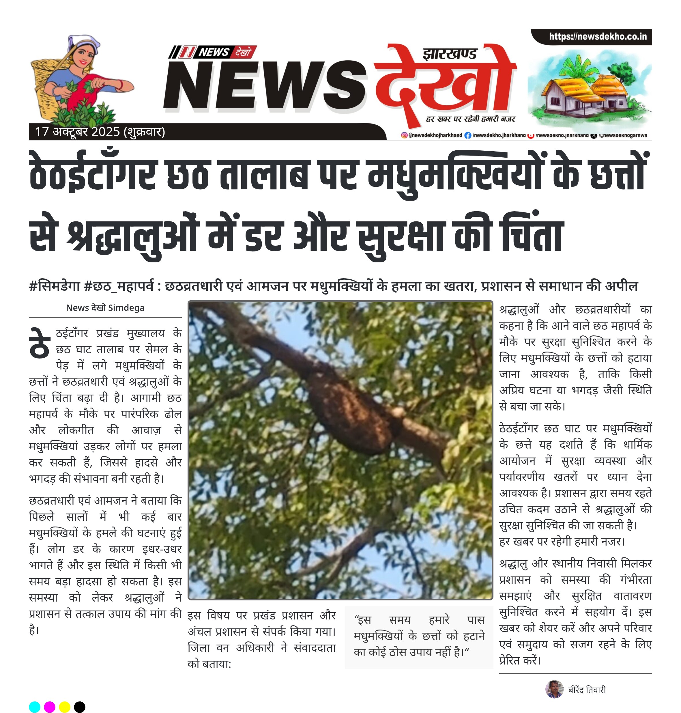 #सिमडेगा #छठ_महापर्व : छठव्रतधारी एवं आमजन पर मधुमक्खियों के हमला का खतरा, प्रशासन से समाधान की अपील ठेठईटाँगर प्रखंड के छठ घाट तालाब के सेमल के पेड़ में मधुमक्खियों के कई छत्ते लगे। छठव्रतधारी और श्रद्धालु मधुमक्खियों के हमले से डर रहे हैं। बीते अवसरों पर मधुमक्खियों के हमले के कारण भगदड़ जैसी स्थिति बनी। प्रखंड और अंचल प्रशासन को समस्या से अवगत कराया गया। जिला वन अधिकारी ने बताया कि फिलहाल कोई ठोस उपाय उपलब्ध नहीं है। ठेठईटाँगर प्रखंड…