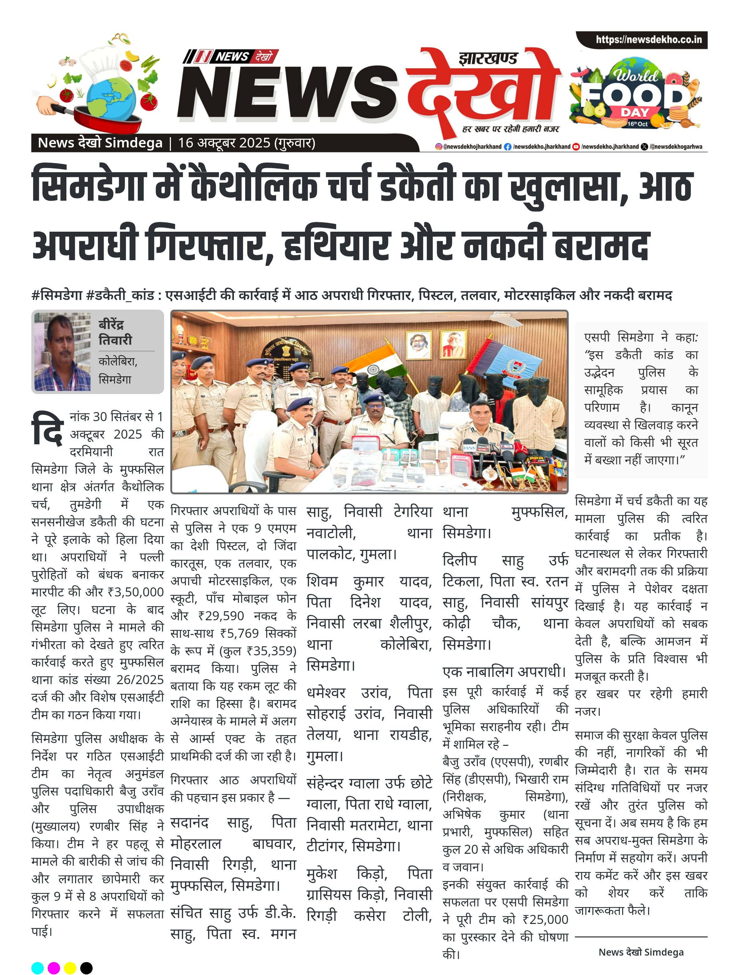 #सिमडेगा #डकैती_कांड : एसआईटी की कार्रवाई में आठ अपराधी गिरफ्तार, पिस्टल, तलवार, मोटरसाइकिल और नकदी बरामद कैथोलिक चर्च, तुमडेगी में रात्रि में हुई डकैती की गुत्थी सुलझी। तीन लाख पचास हजार रुपये की लूट में शामिल आठ अपराधी गिरफ्तार। एसपी सिमडेगा के निर्देश पर बनी एसआईटी टीम ने की त्वरित कार्रवाई। घटना में प्रयुक्त पिस्टल, तलवार, अपाची मोटरसाइकिल, स्कूटी और 35,359 रुपये बरामद। छापेमारी दल के अधिकारियों को 25,000 रुपये का पुरस्कार मिला। दिनांक 30 सितंबर से 1 अक्टूबर 2025…