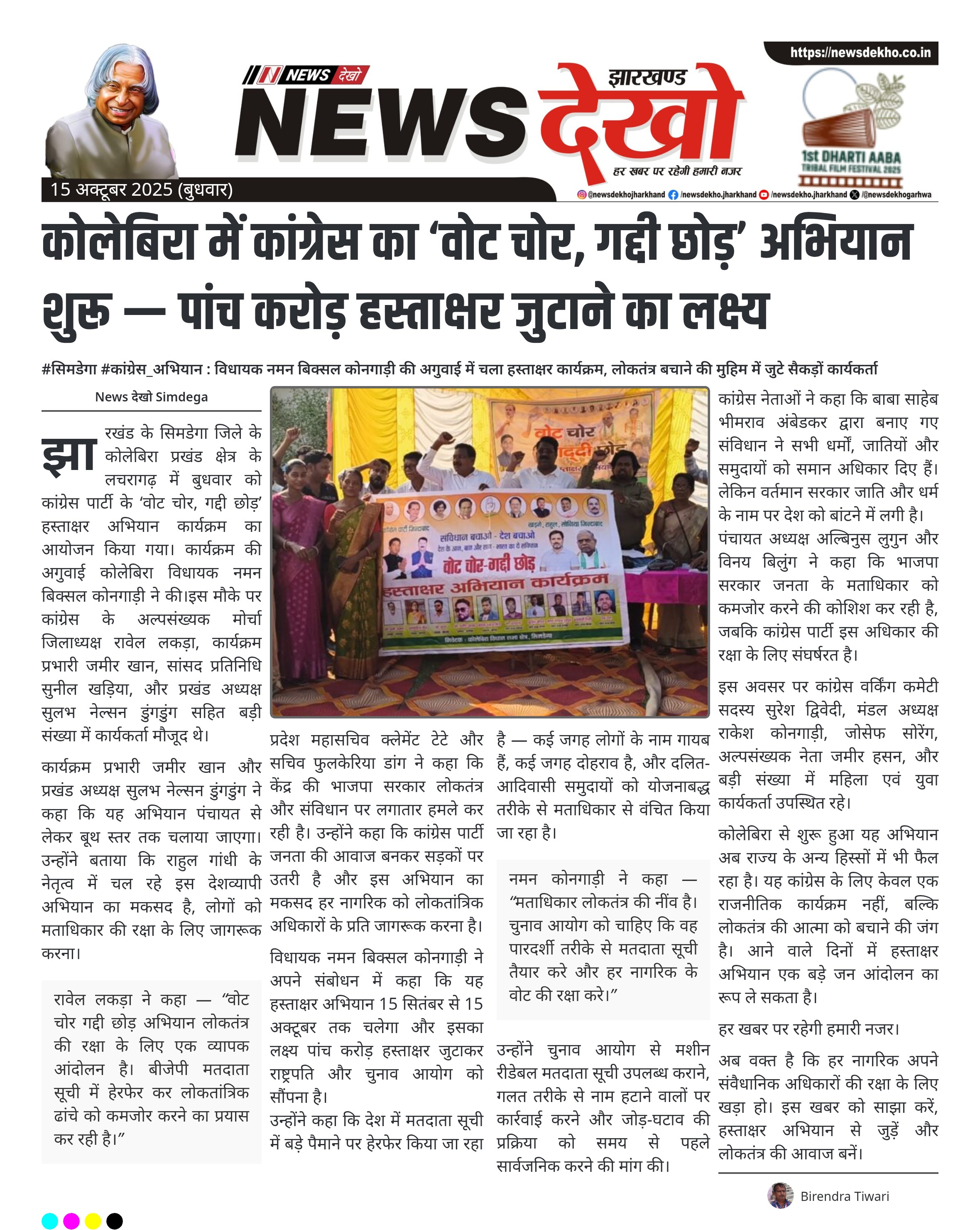 #सिमडेगा #कांग्रेस_अभियान : विधायक नमन बिक्सल कोनगाड़ी की अगुवाई में चला हस्ताक्षर कार्यक्रम, लोकतंत्र बचाने की मुहिम में जुटे सैकड़ों कार्यकर्ता कोलेबिरा के लचरागढ़ में कांग्रेस का ‘वोट चोर, गद्दी छोड़’ हस्ताक्षर अभियान का हुआ भव्य शुभारंभ। कार्यक्रम की अगुवाई विधायक नमन बिक्सल कोनगाड़ी ने की, जिसमें सैकड़ों कार्यकर्ता शामिल हुए। अभियान का उद्देश्य पांच करोड़ हस्ताक्षर जुटाकर राष्ट्रपति और चुनाव आयोग को सौंपना है। राहुल गांधी के नेतृत्व में चल रही इस राष्ट्रीय मुहिम के तहत लोकतंत्र और मताधिकार…