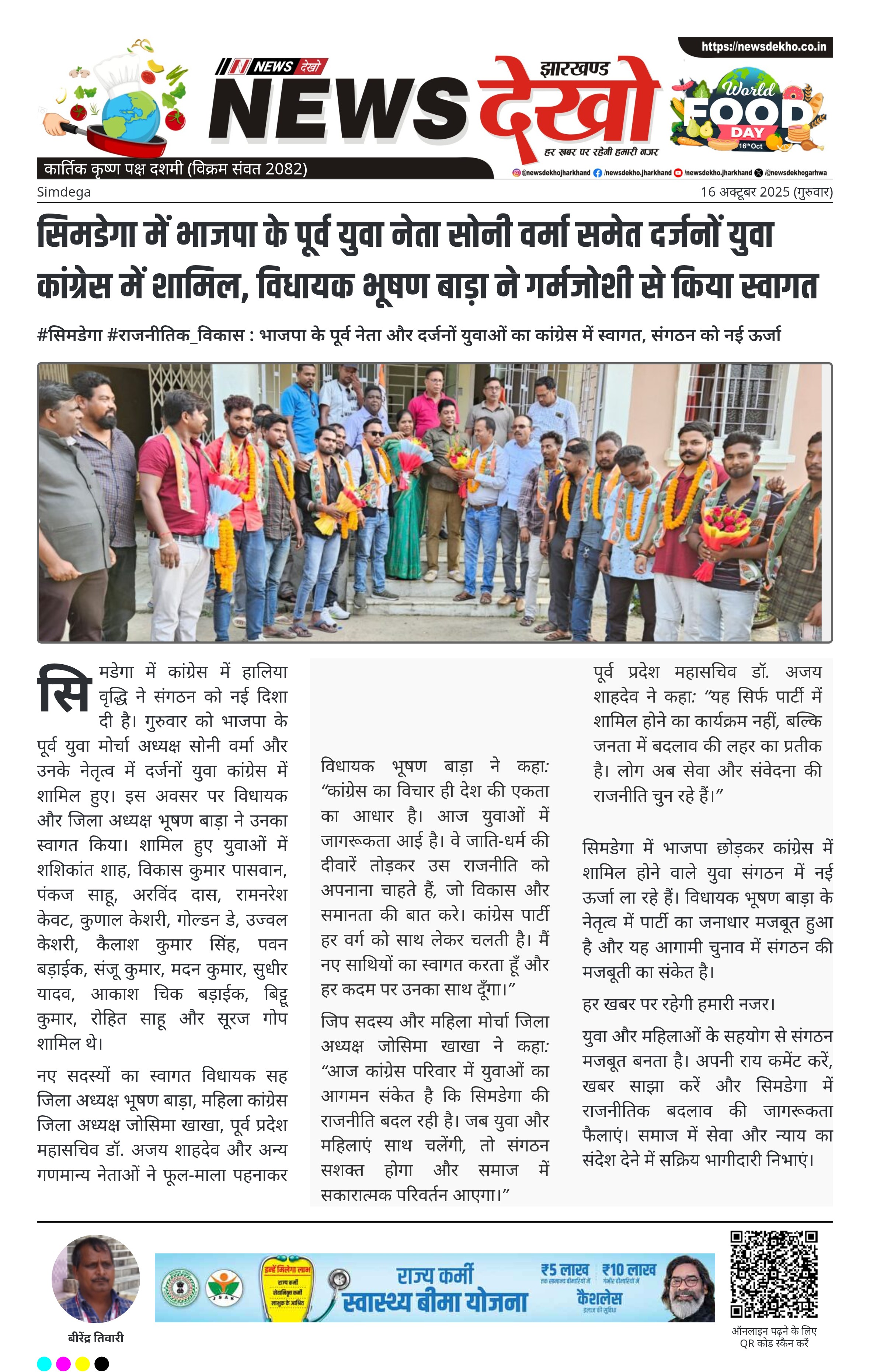 #सिमडेगा #राजनीतिक_विकास : भाजपा के पूर्व नेता और दर्जनों युवाओं का कांग्रेस में स्वागत, संगठन को नई ऊर्जा भाजपा के पूर्व युवा मोर्चा अध्यक्ष सोनी वर्मा और अन्य दर्जनों युवाओं ने कांग्रेस में सदस्यता ली। शामिल हुए युवा नेताओं में शशिकांत शाह, विकास कुमार पासवान, पंकज साहू समेत कई प्रमुख युवा शामिल। नए सदस्यों का स्वागत विधायक भूषण बाड़ा, महिला कांग्रेस जिला अध्यक्ष जोसिमा खाखा और पूर्व प्रदेश महासचिव डॉ. अजय शाहदेव ने किया। भाजपा छोड़कर कांग्रेस में आने का…
