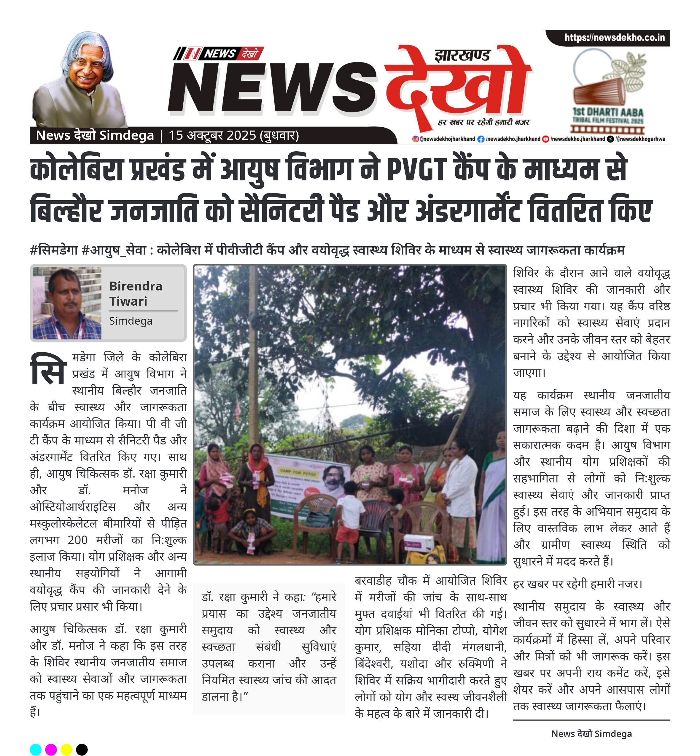 #सिमडेगा #आयुष_सेवा : कोलेबिरा में पीवीजीटी कैंप और वयोवृद्ध स्वास्थ्य शिविर के माध्यम से स्वास्थ्य जागरूकता कार्यक्रम कोलेबिरा प्रखंड में बिल्हौर जनजाति के बीच पी वी जी टी कैंप आयोजित किया गया। आयुष चिकित्सक डॉ. रक्षा कुमारी और डॉ. मनोज ने लगभग 200 मरीजों का नि:शुल्क उपचार किया। सैनिटरी पैड और अंडरगार्मेंट का वितरण किया गया। योग प्रशिक्षक योगेश कुमार, मोनिका टोप्पो, और अन्य स्थानीय सहयोगियों ने स्वास्थ्य शिविर और आगामी वयोवृद्ध कैंप का प्रचार किया। शिविर में Osteoarthritis और…
