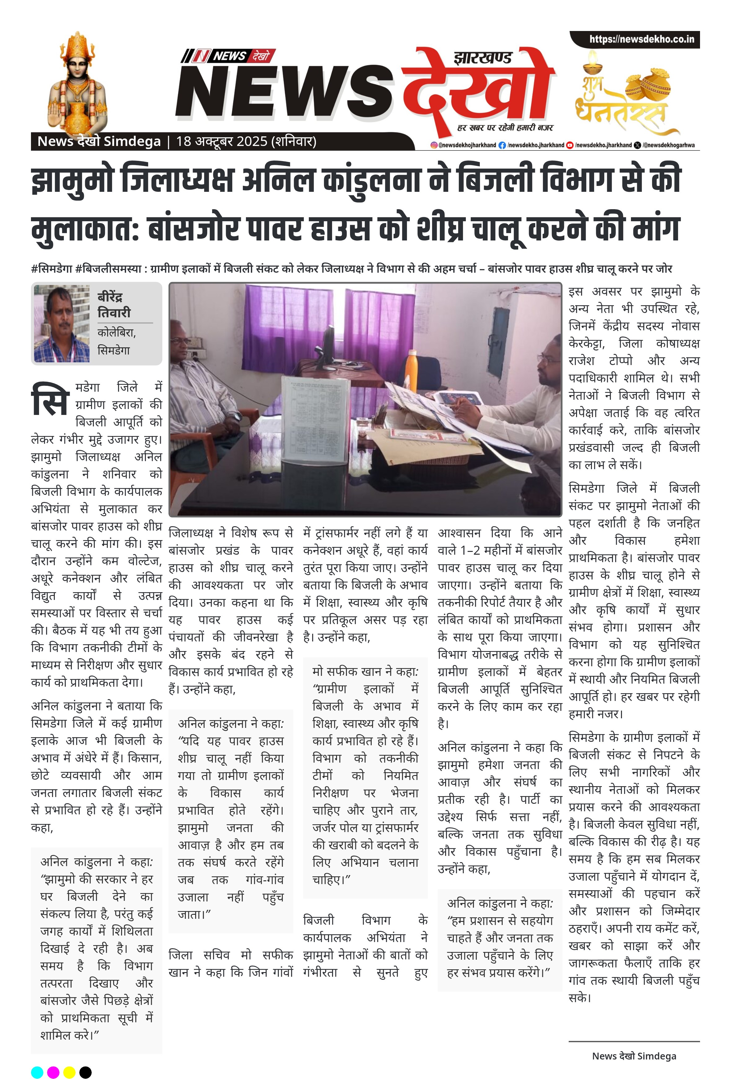 झामुमो जिलाध्यक्ष अनिल कांडुलना ने बिजली विभाग से की मुलाकात: बांसजोर पावर हाउस को शीघ्र चालू करने की मांग
