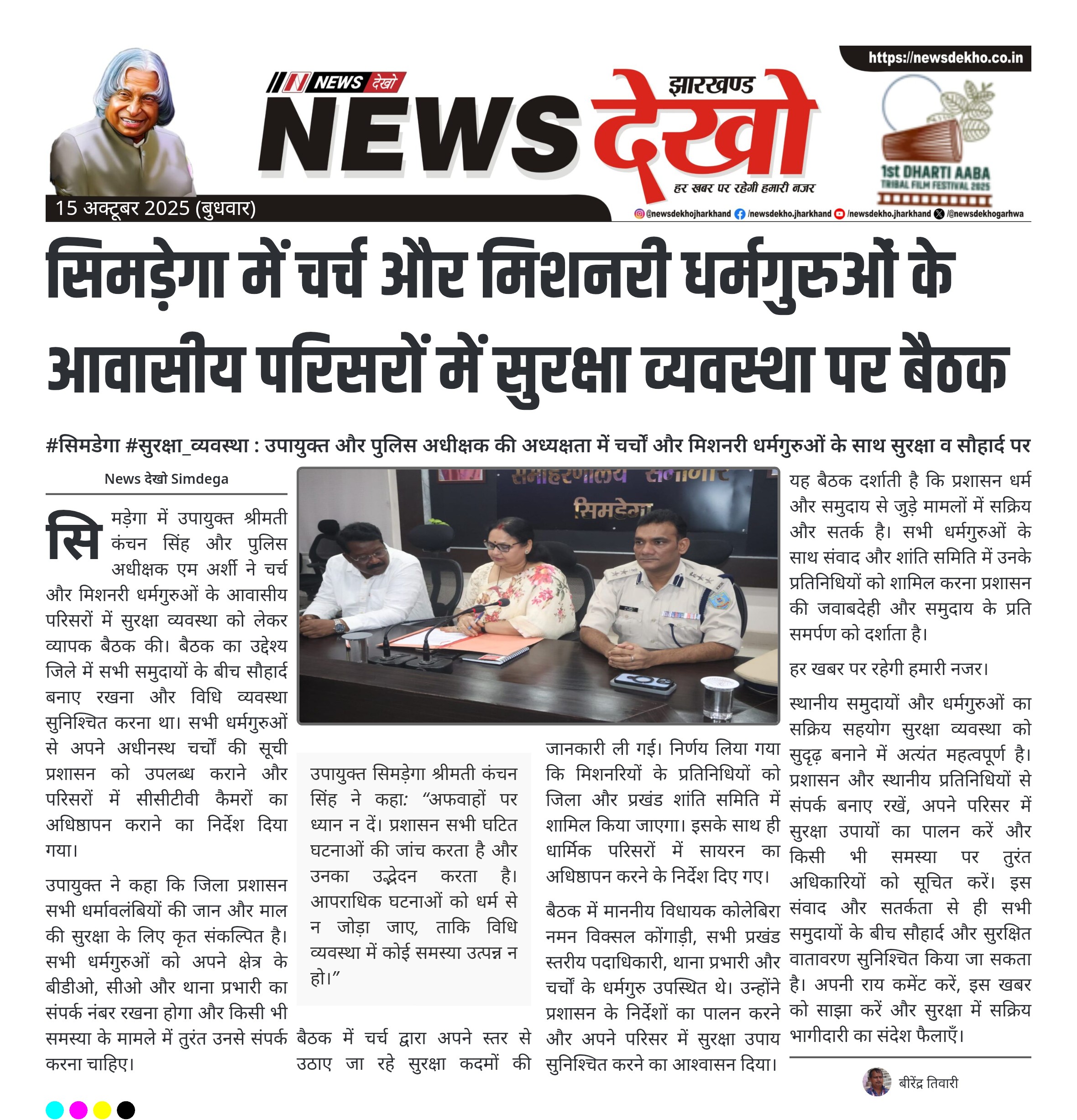 #सिमडेगा #सुरक्षा_व्यवस्था : उपायुक्त और पुलिस अधीक्षक की अध्यक्षता में चर्चों और मिशनरी धर्मगुरुओं के साथ सुरक्षा व सौहार्द पर चर्चा उपायुक्त सिमडेगा श्रीमती कंचन सिंह और पुलिस अधीक्षक एम अर्शी की संयुक्त अध्यक्षता में बैठक। सभी चर्चों के धर्मगुरुओं से अपने अधीनस्थ चर्चों की सूची प्रशासन को उपलब्ध कराने का निर्देश। चर्च और आवासीय परिसर में सीसीटीवी कैमरा अधिष्ठापन कराने का आदेश। मिशनरियों के प्रतिनिधियों को जिला और प्रखंड शांति समिति में शामिल करने का निर्णय। सभी धर्मगुरुओं को…