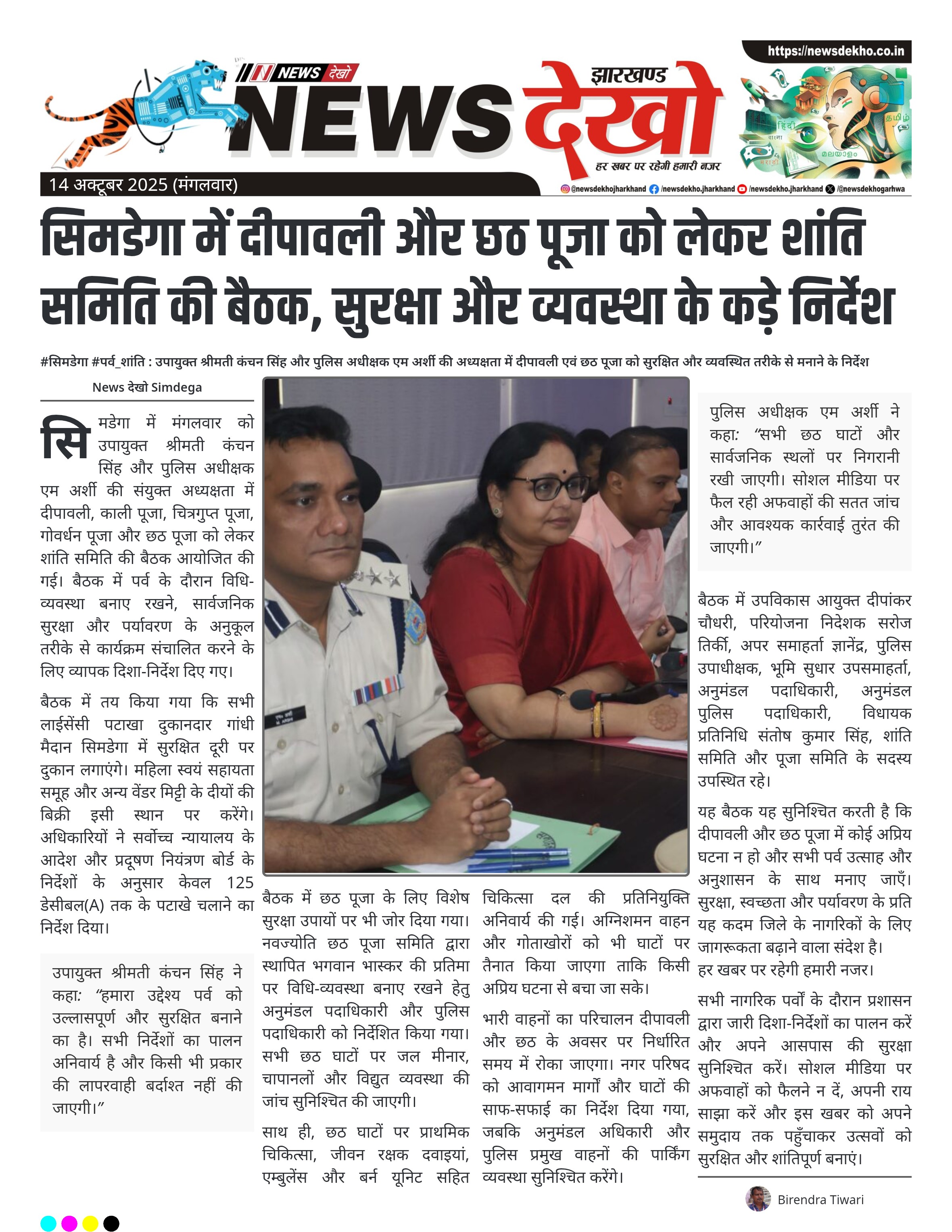 #सिमडेगा #पर्व_शांति : उपायुक्त श्रीमती कंचन सिंह और पुलिस अधीक्षक एम अर्शी की अध्यक्षता में दीपावली एवं छठ पूजा को सुरक्षित और व्यवस्थित तरीके से मनाने के निर्देश दीपावली एवं छठ पूजा के अवसर पर पटाखों की बिक्री केवल लाईसेंसी दुकानदारों द्वारा गांधी मैदान सिमडेगा में। मिट्टी के दीये की बिक्री महिला स्वयं सहायता समूह एवं अन्य वेंडरों द्वारा निर्धारित स्थल पर कराई जाएगी। आतिशबाजी का समय दीपावली: रात्रि 08:00 से 10:00 बजे, छठ पूजा: प्रातः 06:00 से 08:00 बजे,…