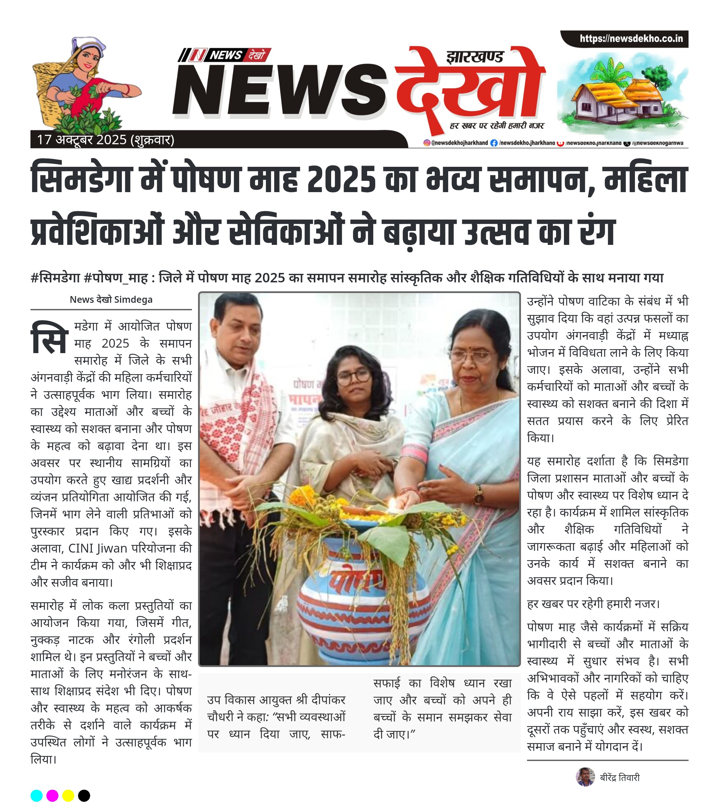 #सिमडेगा #पोषण_माह : जिले में पोषण माह 2025 का समापन समारोह सांस्कृतिक और शैक्षिक गतिविधियों के साथ मनाया गया सिमडेगा में पोषण माह 2025 का समापन समारोह बड़े हर्षोल्लास के साथ संपन्न हुआ। सभी महिला प्रवेशिकाएँ, सेविकाएँ और सहायिकाएँ कार्यक्रम में भाग लेकर उत्सव को जीवंत बनाया। स्थानीय सामग्रियों का उपयोग करते हुए खाद्य प्रदर्शनी और व्यंजन प्रतियोगिता आयोजित की गई और विजेताओं को पुरस्कार प्रदान किए गए। CINI Jiwan परियोजना की टीम ने भी कार्यक्रम में भाग लिया। गीत,…