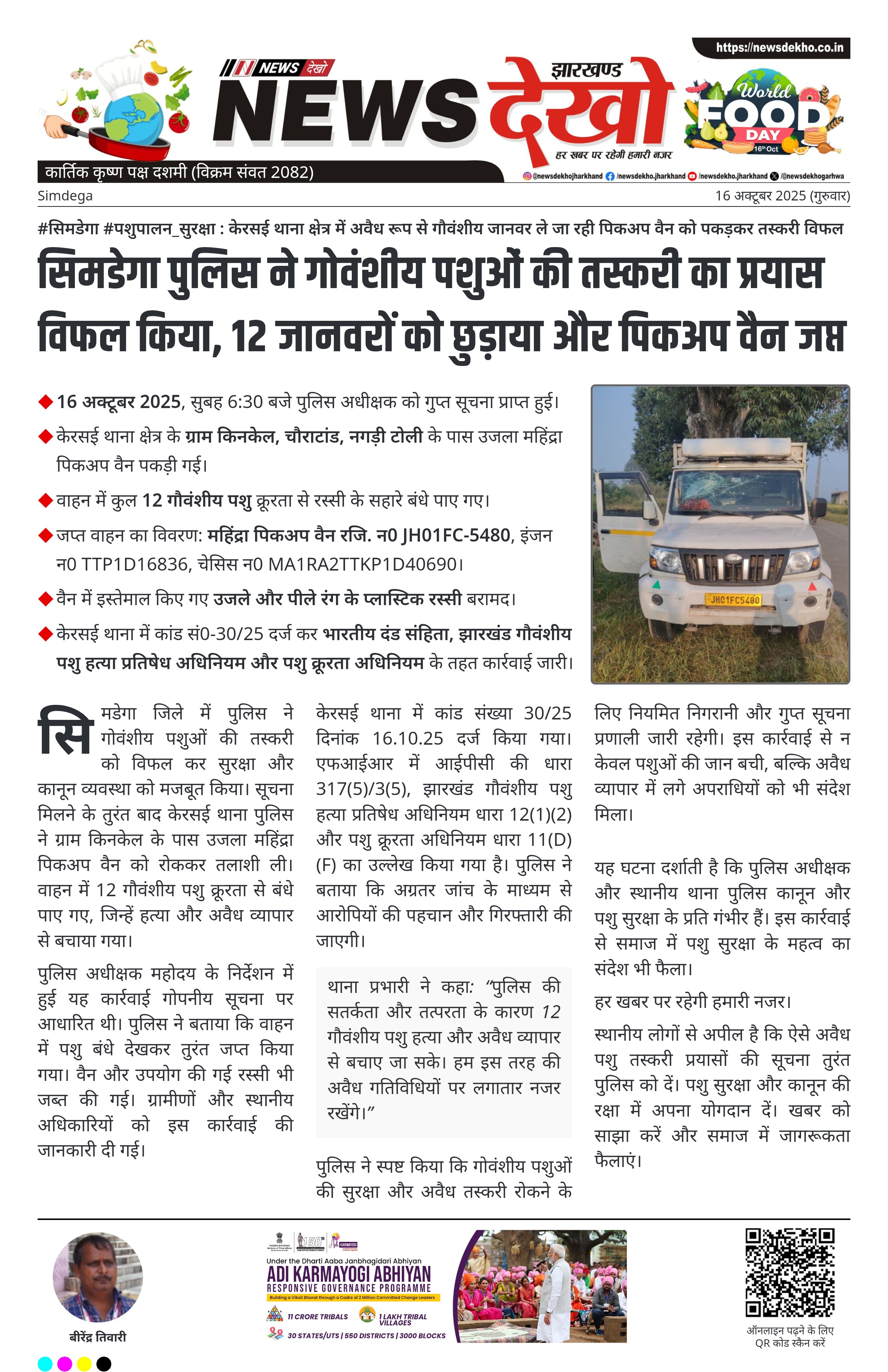 #सिमडेगा #पशुपालन_सुरक्षा : केरसई थाना क्षेत्र में अवैध रूप से गौवंशीय जानवर ले जा रही पिकअप वैन को पकड़कर तस्करी विफल 16 अक्टूबर 2025, सुबह 6:30 बजे पुलिस अधीक्षक को गुप्त सूचना प्राप्त हुई। केरसई थाना क्षेत्र के ग्राम किनकेल, चौराटांड, नगड़ी टोली के पास उजला महिंद्रा पिकअप वैन पकड़ी गई। वाहन में कुल 12 गौवंशीय पशु क्रूरता से रस्सी के सहारे बंधे पाए गए। जप्त वाहन का विवरण: महिंद्रा पिकअप वैन रजि. न0 JH01FC-5480, इंजन न0 TTP1D16836, चेसिस न0…