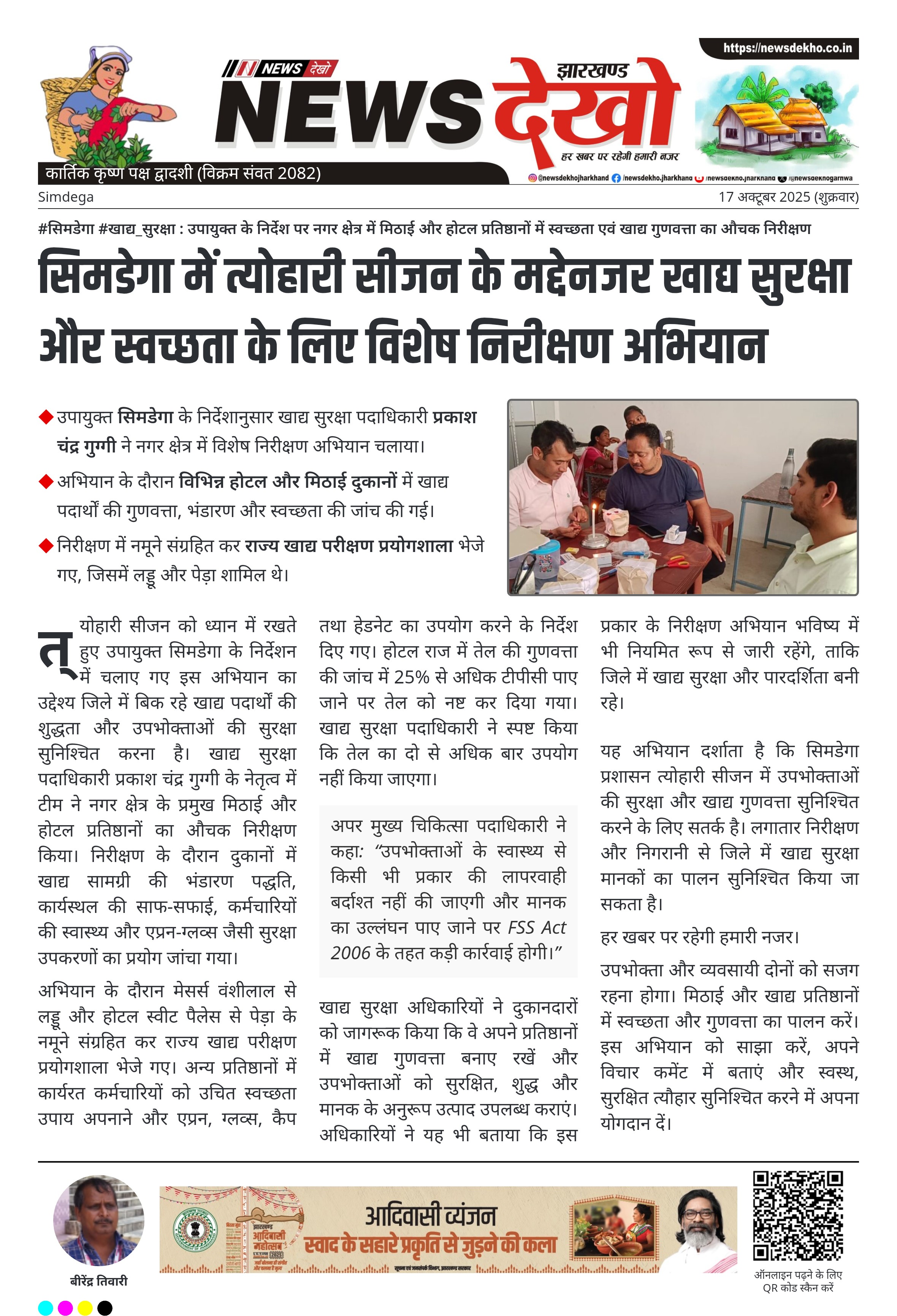 सिमडेगा में त्योहारी सीजन के मद्देनजर खाद्य सुरक्षा और स्वच्छता के लिए विशेष निरीक्षण अभियान