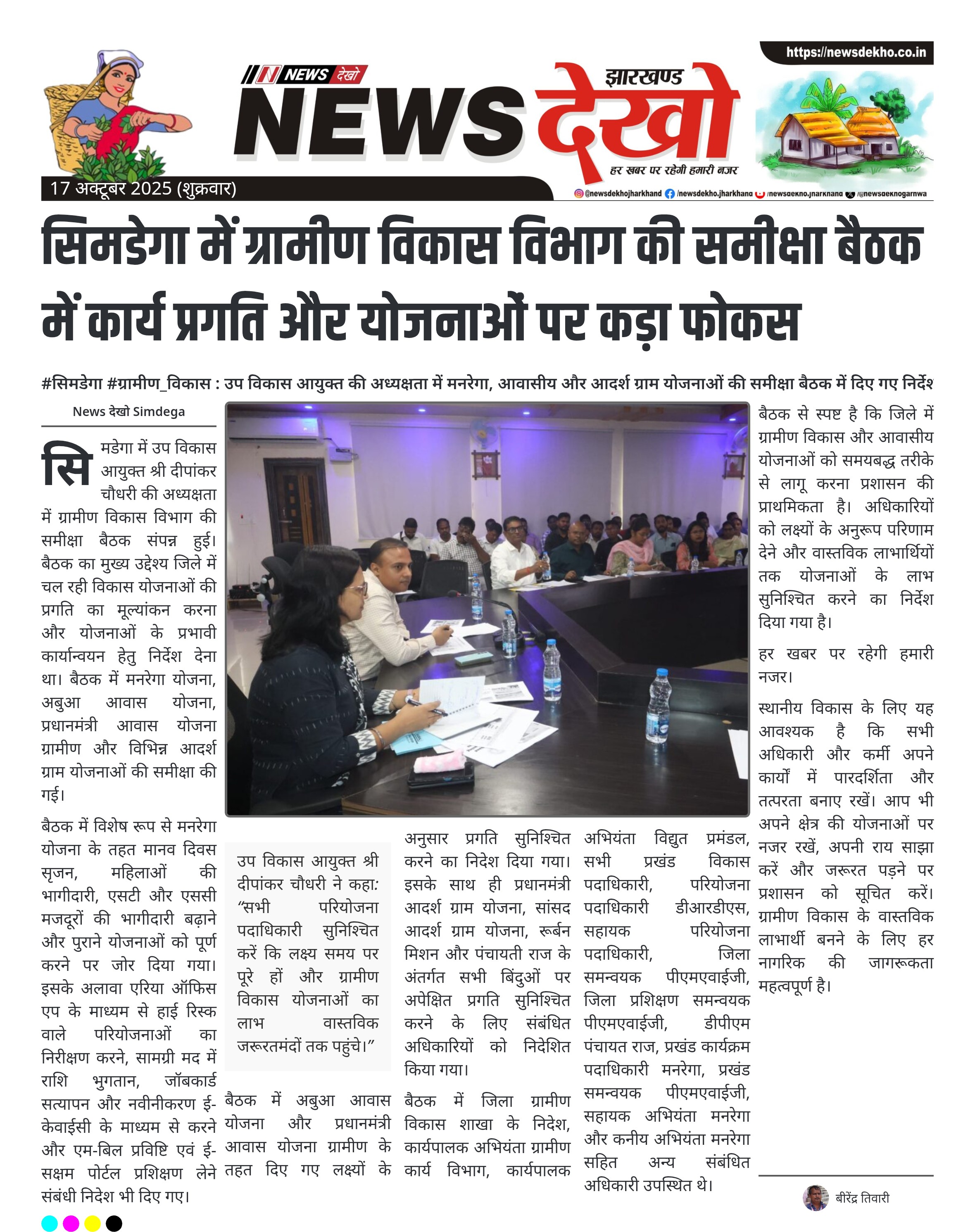 #सिमडेगा #ग्रामीण_विकास : उप विकास आयुक्त की अध्यक्षता में मनरेगा, आवासीय और आदर्श ग्राम योजनाओं की समीक्षा बैठक में दिए गए निर्देश बैठक की अध्यक्षता उप विकास आयुक्त श्री दीपांकर चौधरी ने की। मनरेगा योजना अंतर्गत मानव दिवस सृजन, महिलाओं और एसटी/एससी मजदूरों की भागीदारी बढ़ाने पर जोर दिया गया। बिरसा हरित ग्राम योजना में शत-प्रतिशत गड्डा भराई और पौधा लगाने, एरिया ऑफिस ऐप्प के माध्यम से हाई रिस्क योजना निरीक्षण पर निर्देश। अबुआ आवास योजना और प्रधानमंत्री आवास योजना…