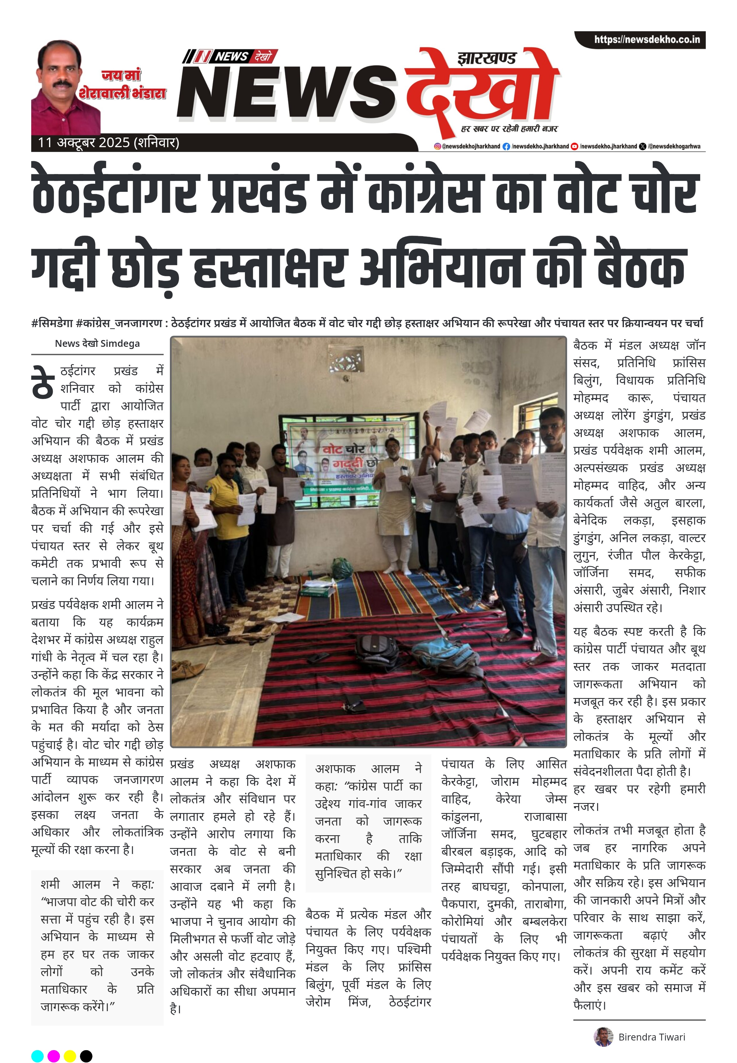 #सिमडेगा #कांग्रेस_जनजागरण : ठेठईटांगर प्रखंड में आयोजित बैठक में वोट चोर गद्दी छोड़ हस्ताक्षर अभियान की रूपरेखा और पंचायत स्तर पर क्रियान्वयन पर चर्चा प्रखंड अध्यक्ष अशफाक आलम की अध्यक्षता में बैठक का आयोजन। मुख्य अतिथि के रूप में प्रखंड पर्यवेक्षक शमी आलम उपस्थित। अभियान को पंचायत से बूथ कमेटी स्तर तक चलाने का निर्णय लिया गया। प्रत्येक मंडल और पंचायत के लिए पर्यवेक्षक नियुक्त, जिसमें पश्चिमी मंडल: फ्रांसिस बिलुंग, पूर्वी मंडल: जेरोम मिंज, सहित अन्य जिम्मेदार। बैठक में विधायक…