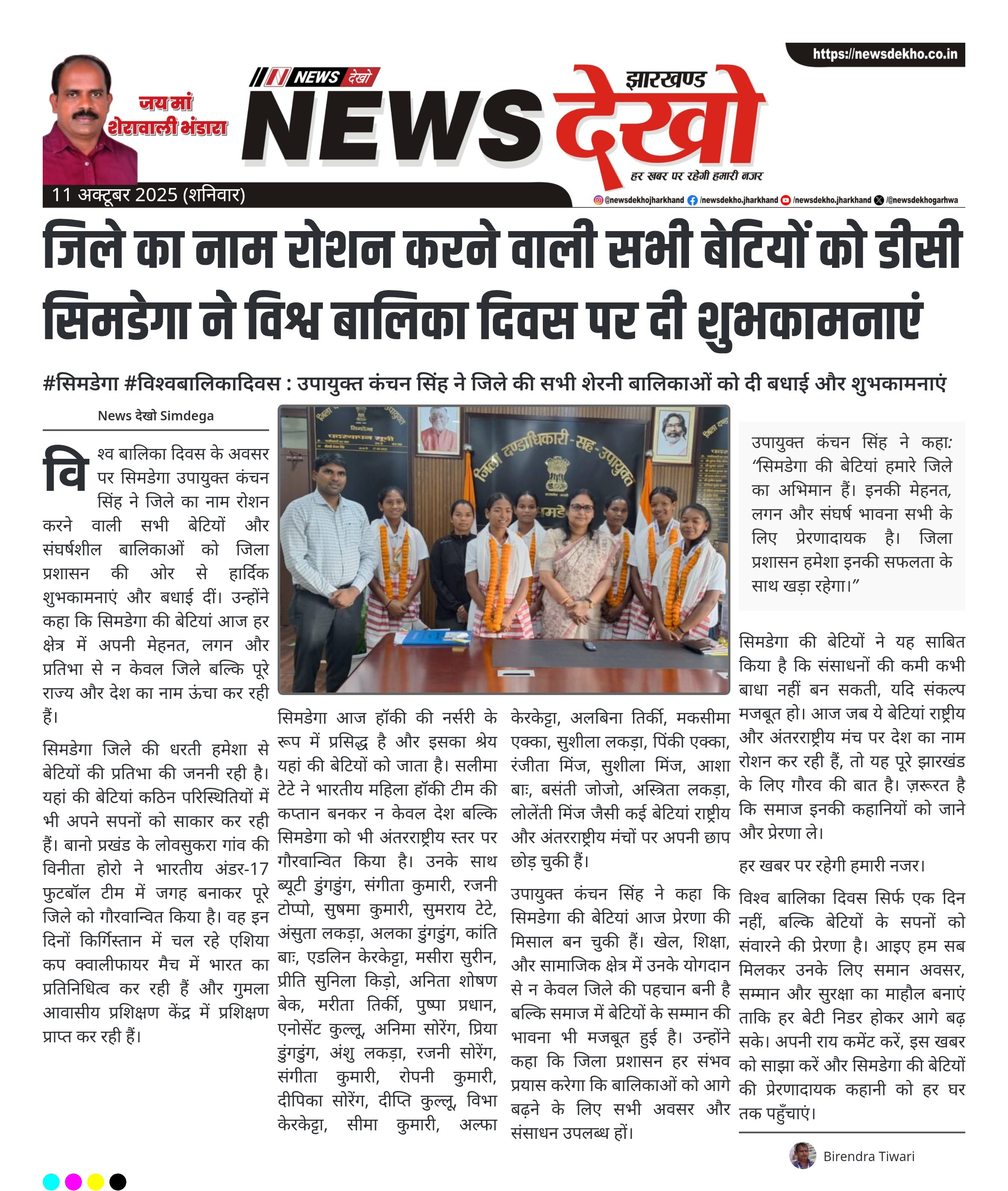 #सिमडेगा #विश्वबालिकादिवस : उपायुक्त कंचन सिंह ने जिले की सभी शेरनी बालिकाओं को दी बधाई और शुभकामनाएं उपायुक्त कंचन सिंह ने विश्व बालिका दिवस पर सिमडेगा की सभी बेटियों को शुभकामनाएं दीं। विनीता होरो ने भारतीय अंडर-17 फुटबॉल टीम में शामिल होकर किया जिले का नाम रोशन। सिमडेगा की बेटियां देश और दुनिया में हॉकी की दुनिया में बिखेर रही हैं अपना जलवा। सलीमा टेटे ने भारतीय महिला हॉकी टीम की कप्तान बनकर दिलाया देश को गर्व। अनेक राष्ट्रीय और…